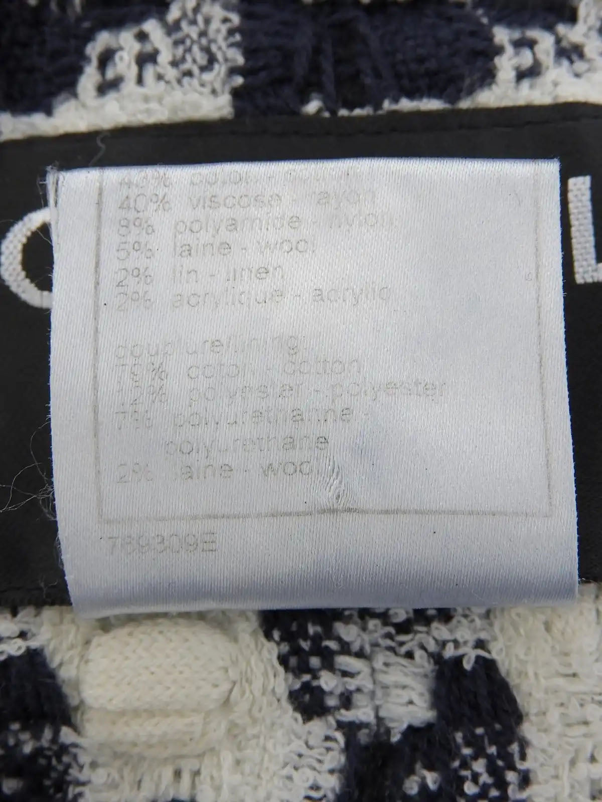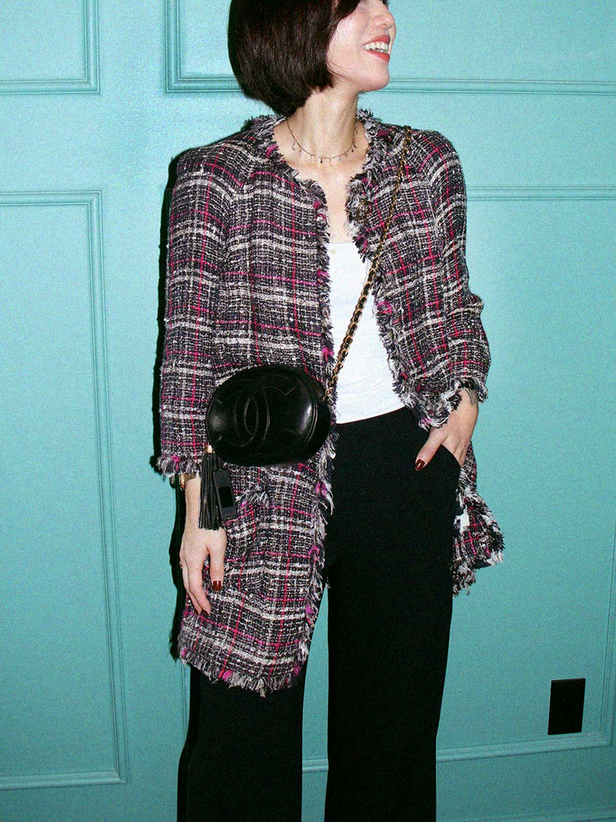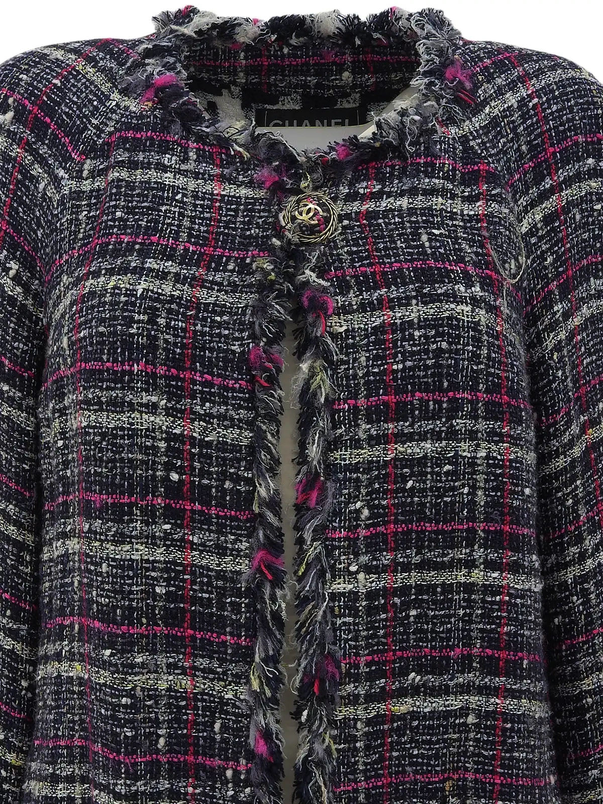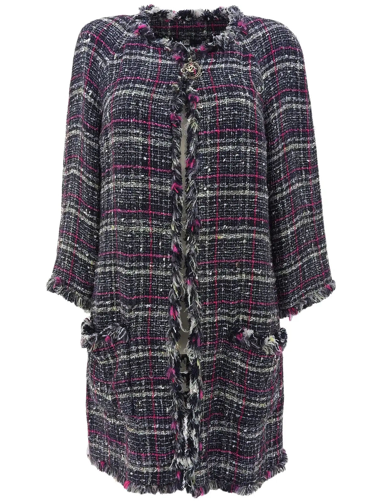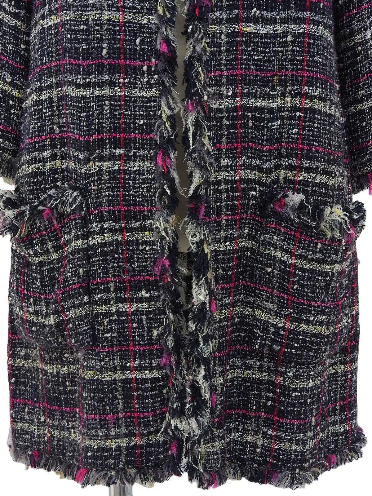 2007年製 ツイードCCマークノーカラーロングジャケット ネイビー/ピンク/マルチ