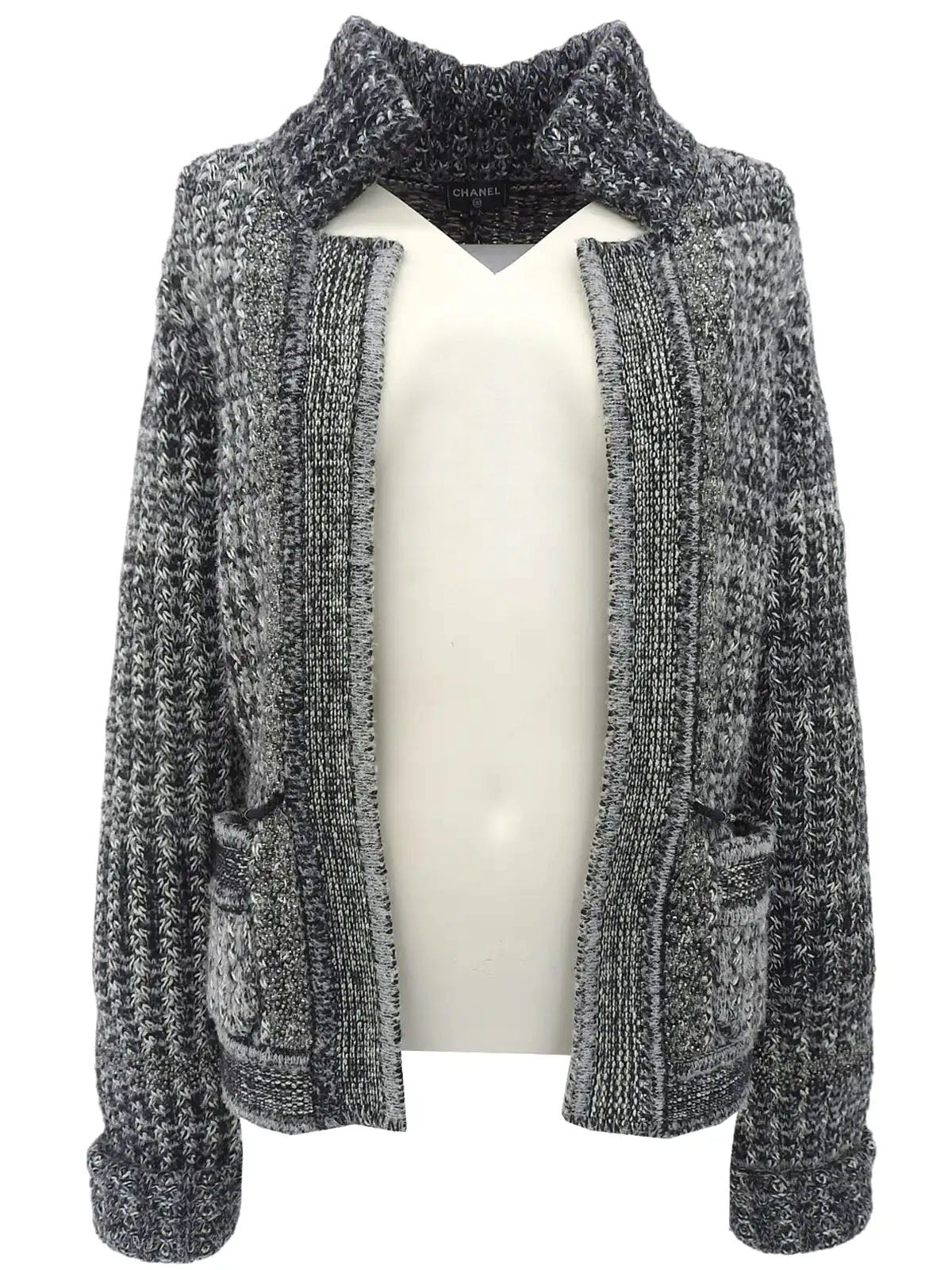 ラインストーンCCマークボタンチェーンデザインニットジャケット グレー/ホワイト