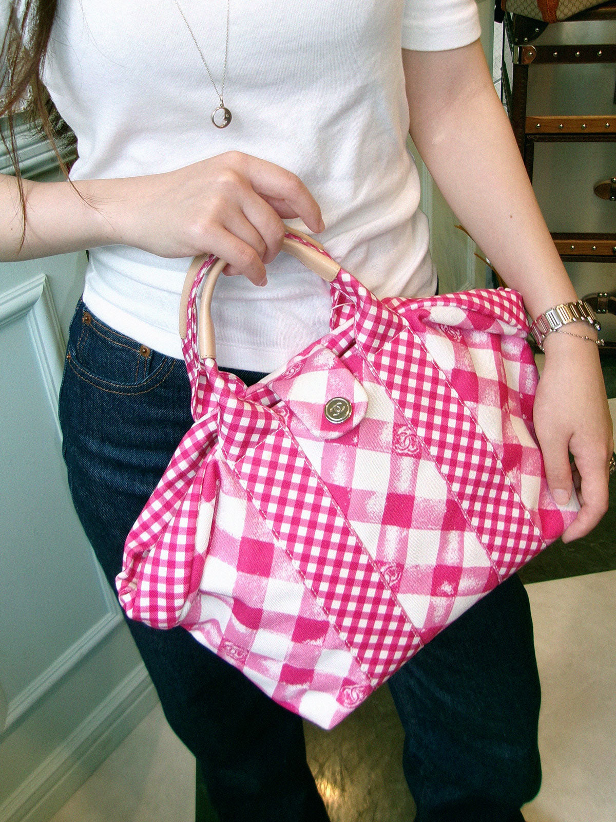 2010年頃製 キャンバスギンガムチェックサークルCCマークハンドバッグ ピンク/ホワイト