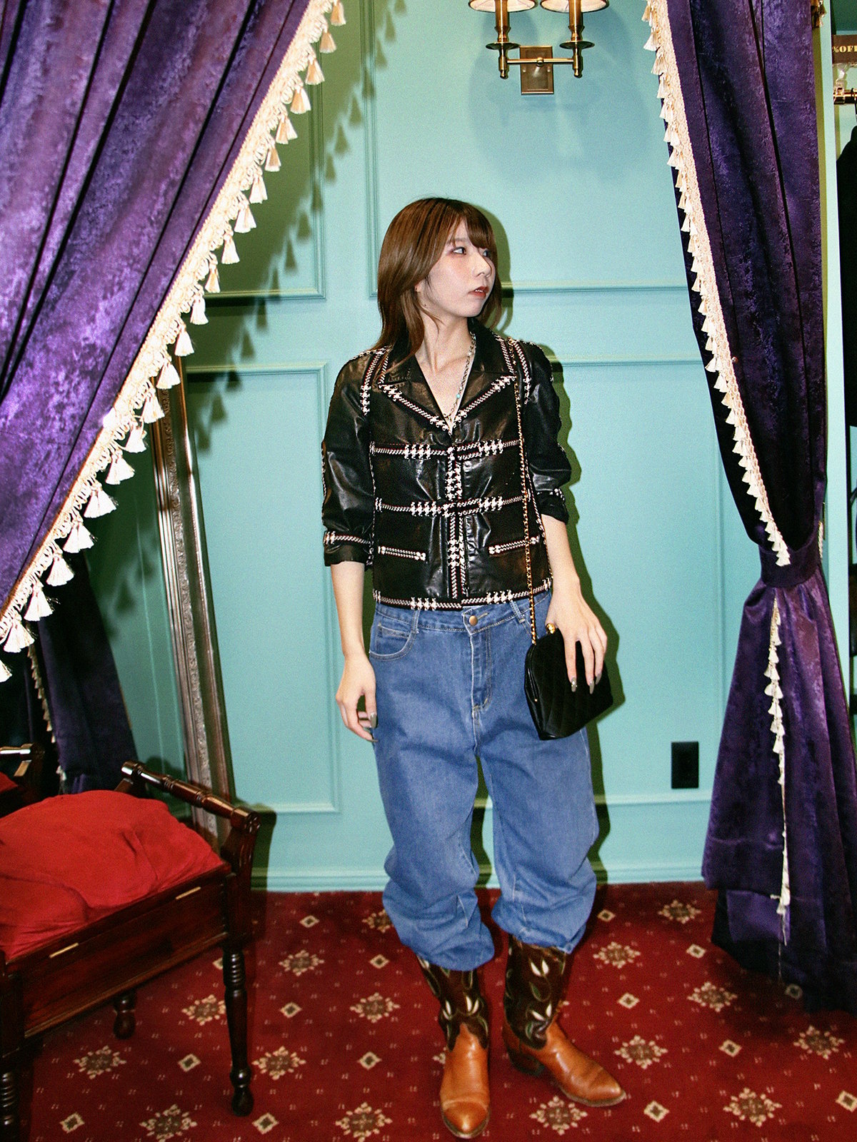 2007年製 レザーツイードコンビCCマークバックルジャケット ブラック/マルチ