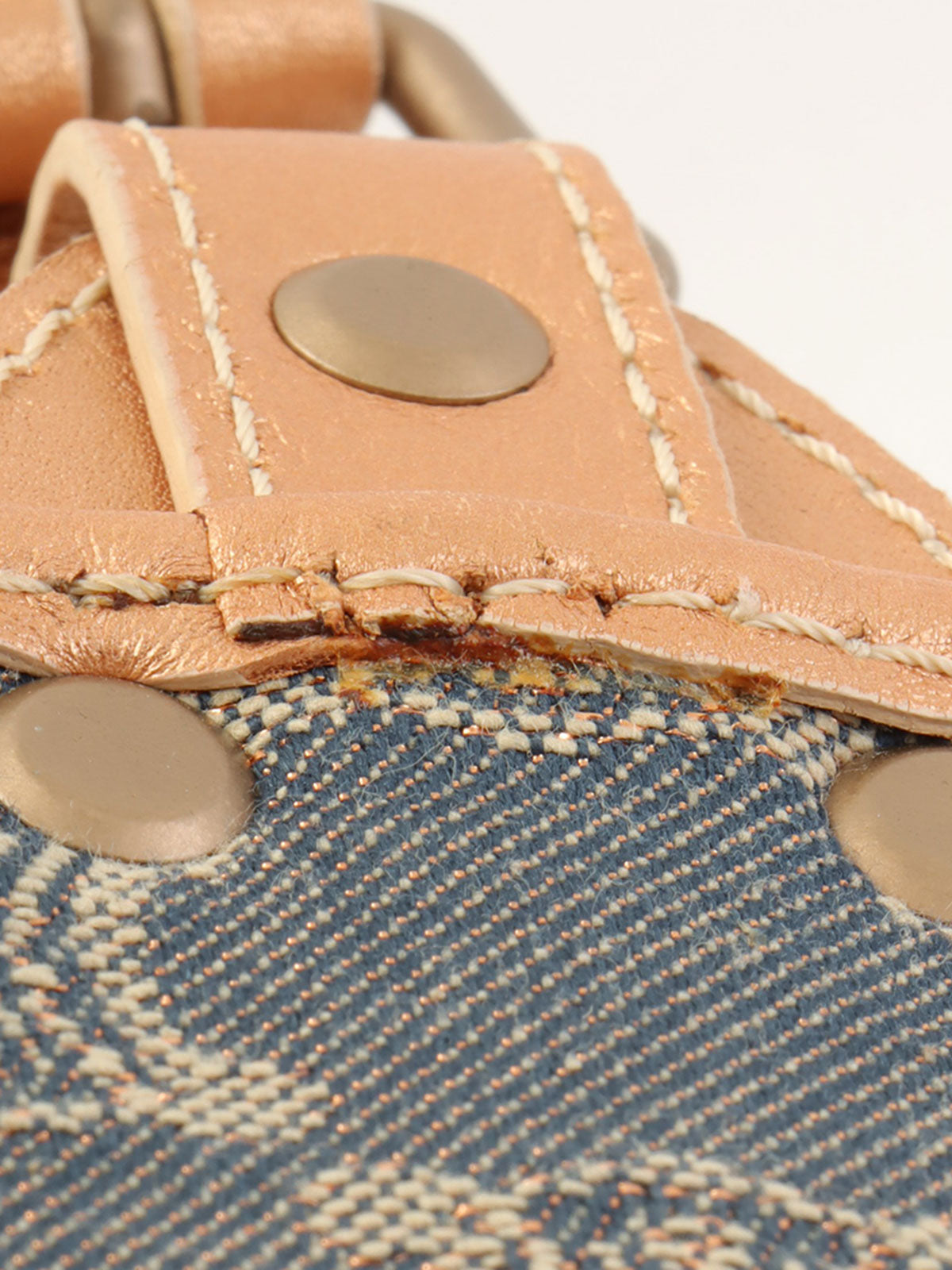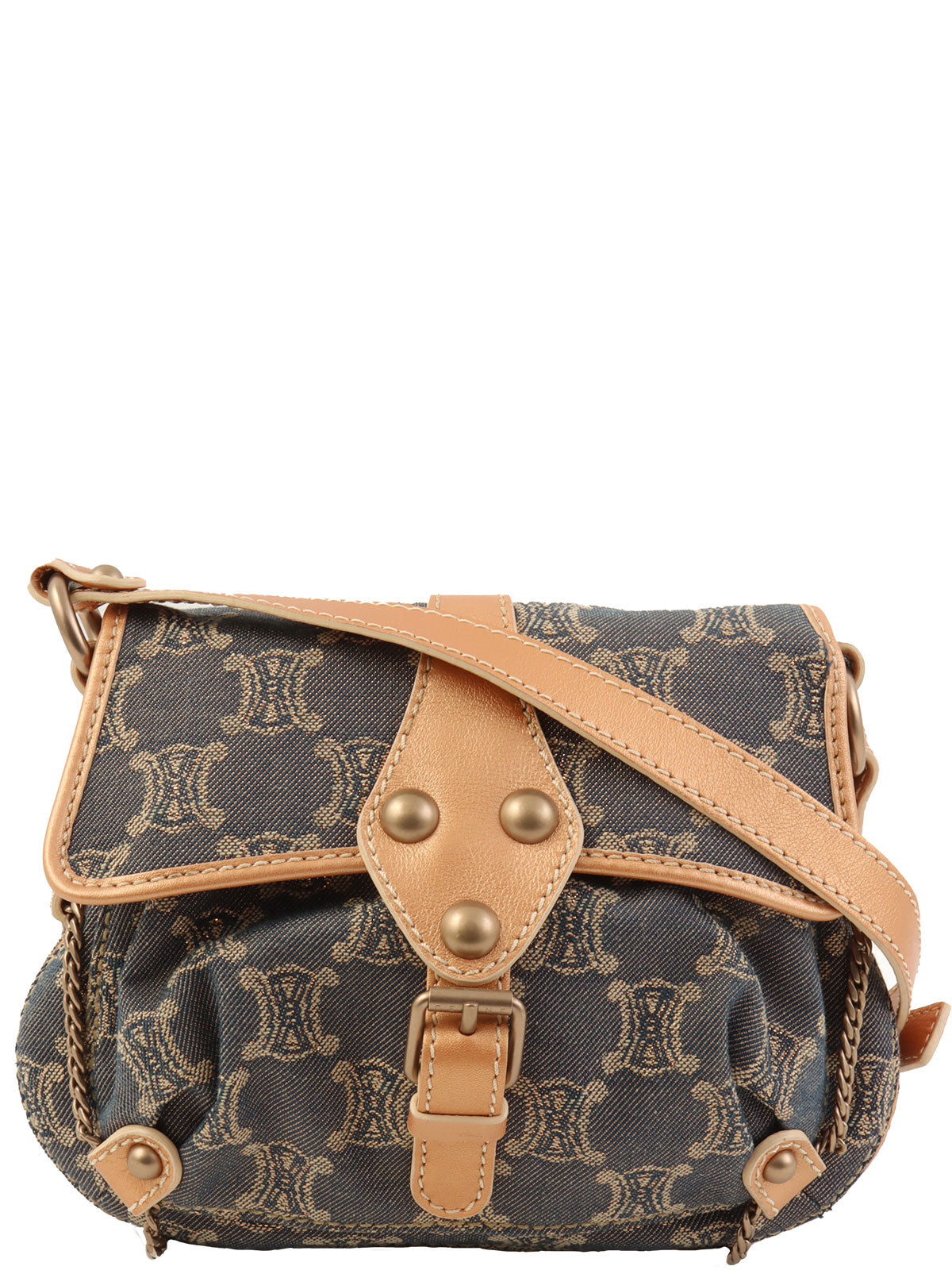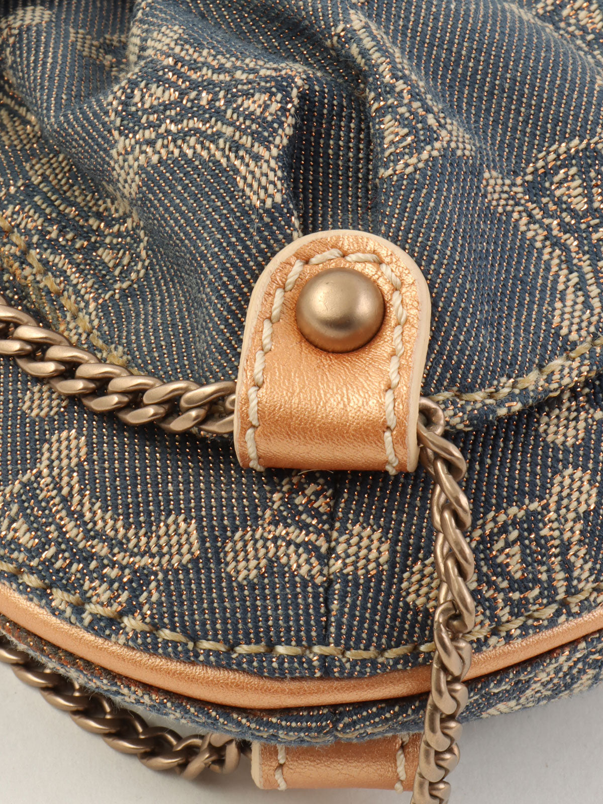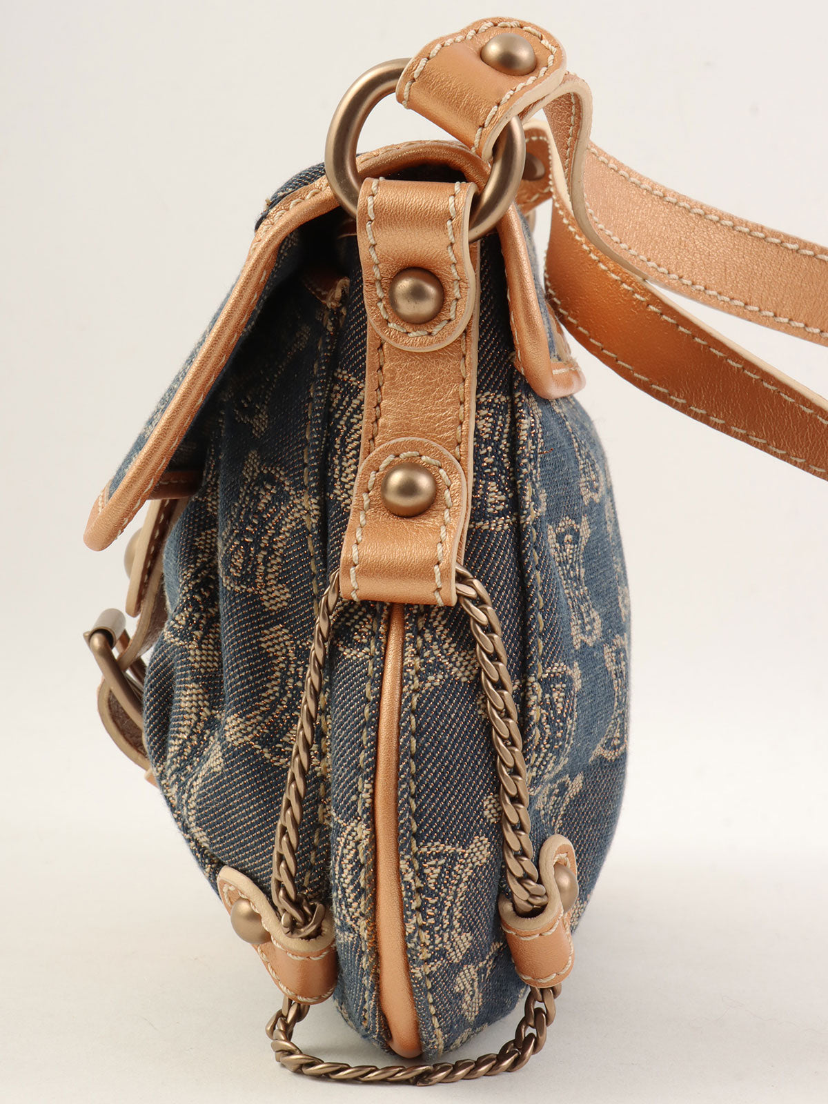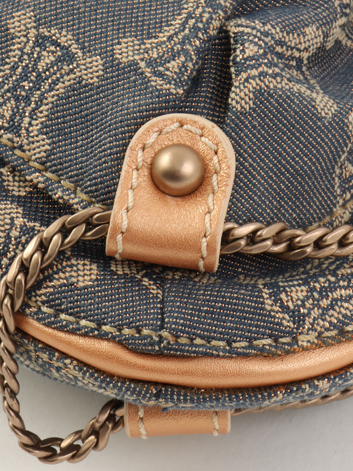 レザーデニムコンビラメマカダムパターンショルダーバッグ ブロンズ/ブルー