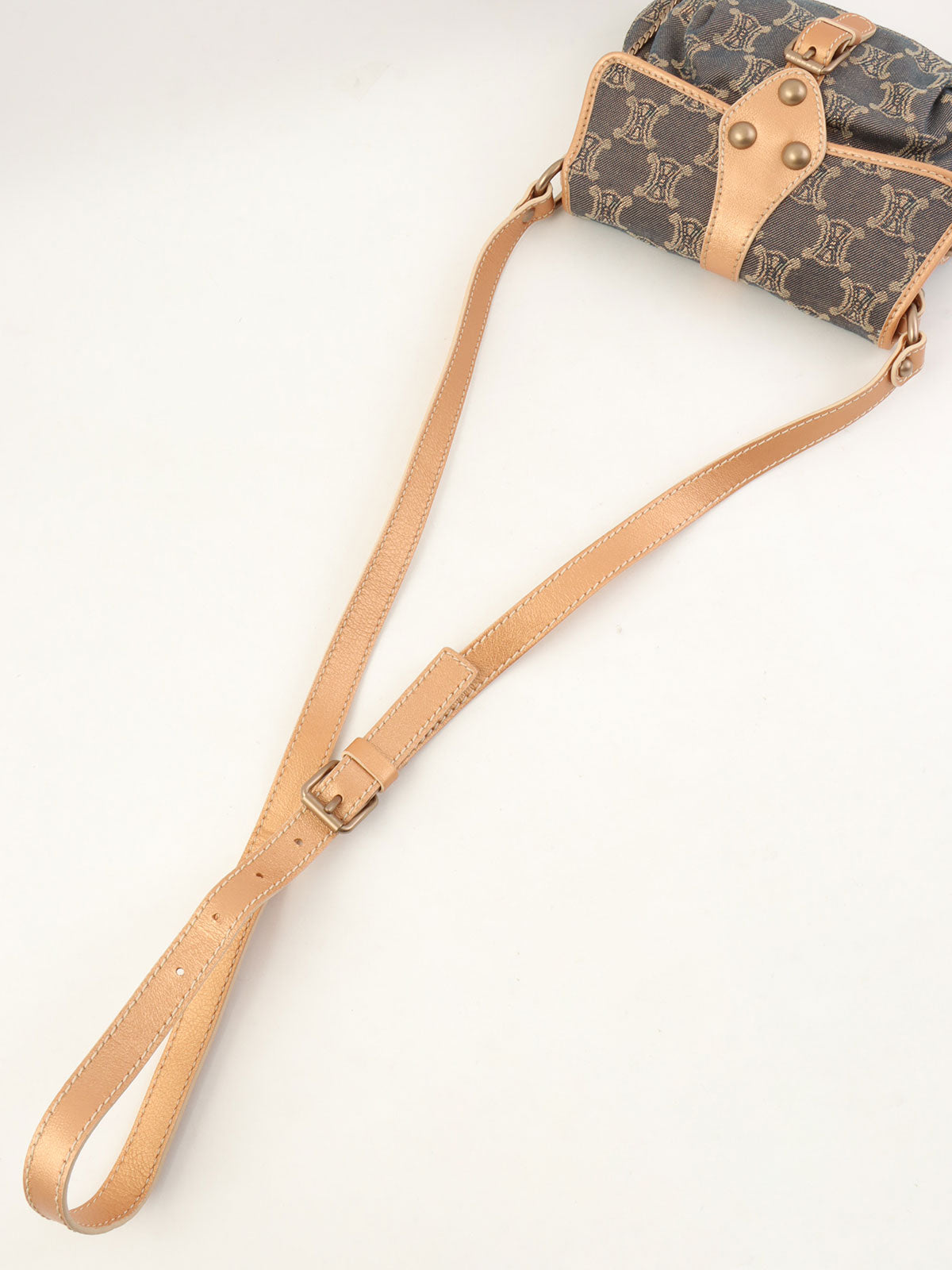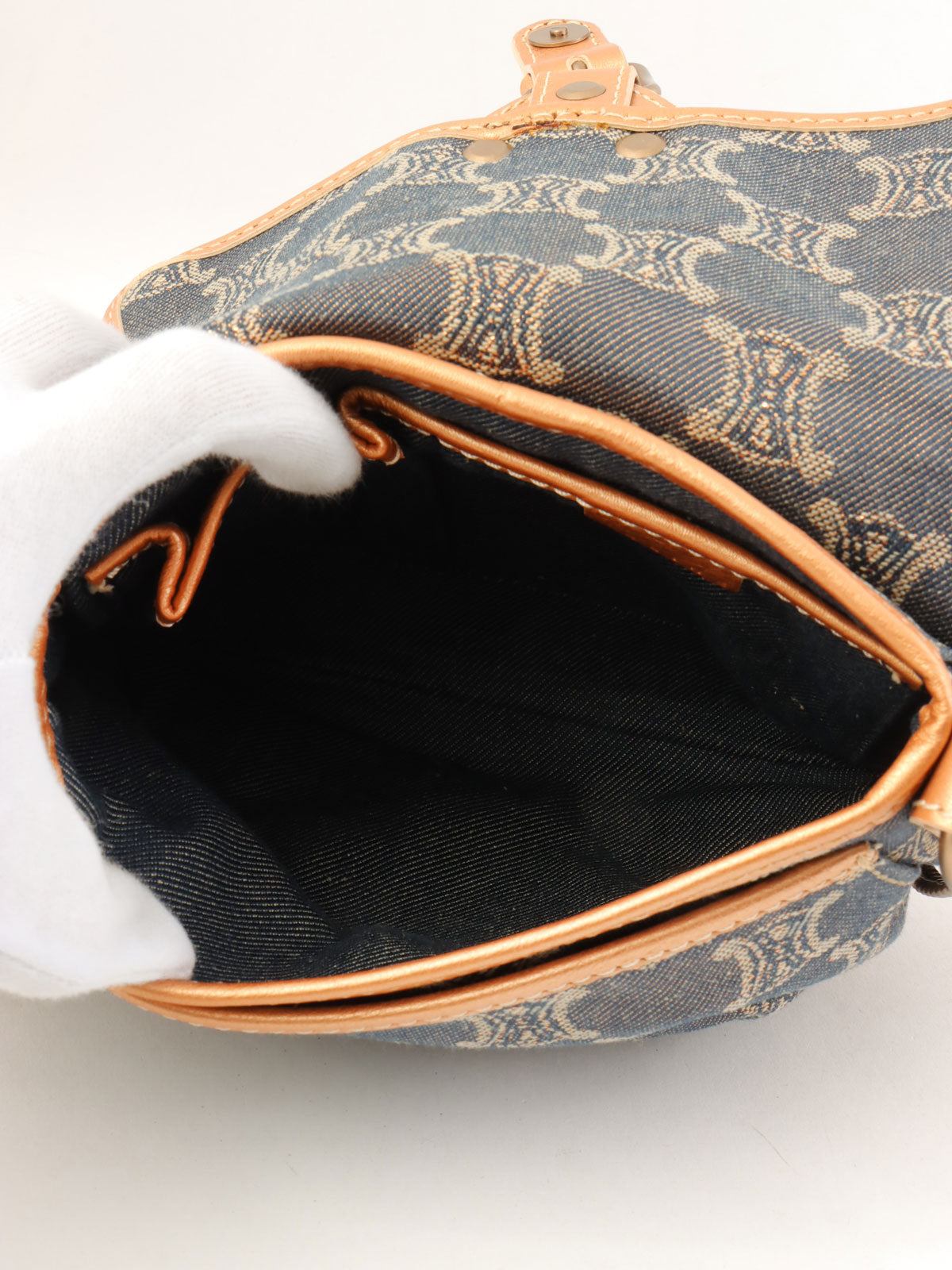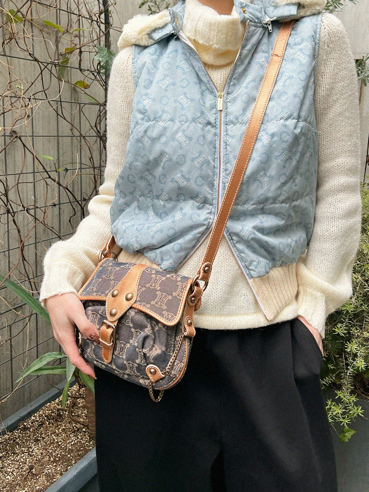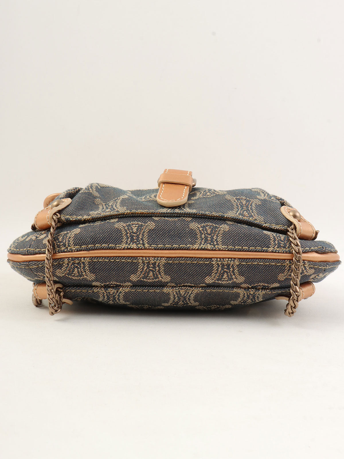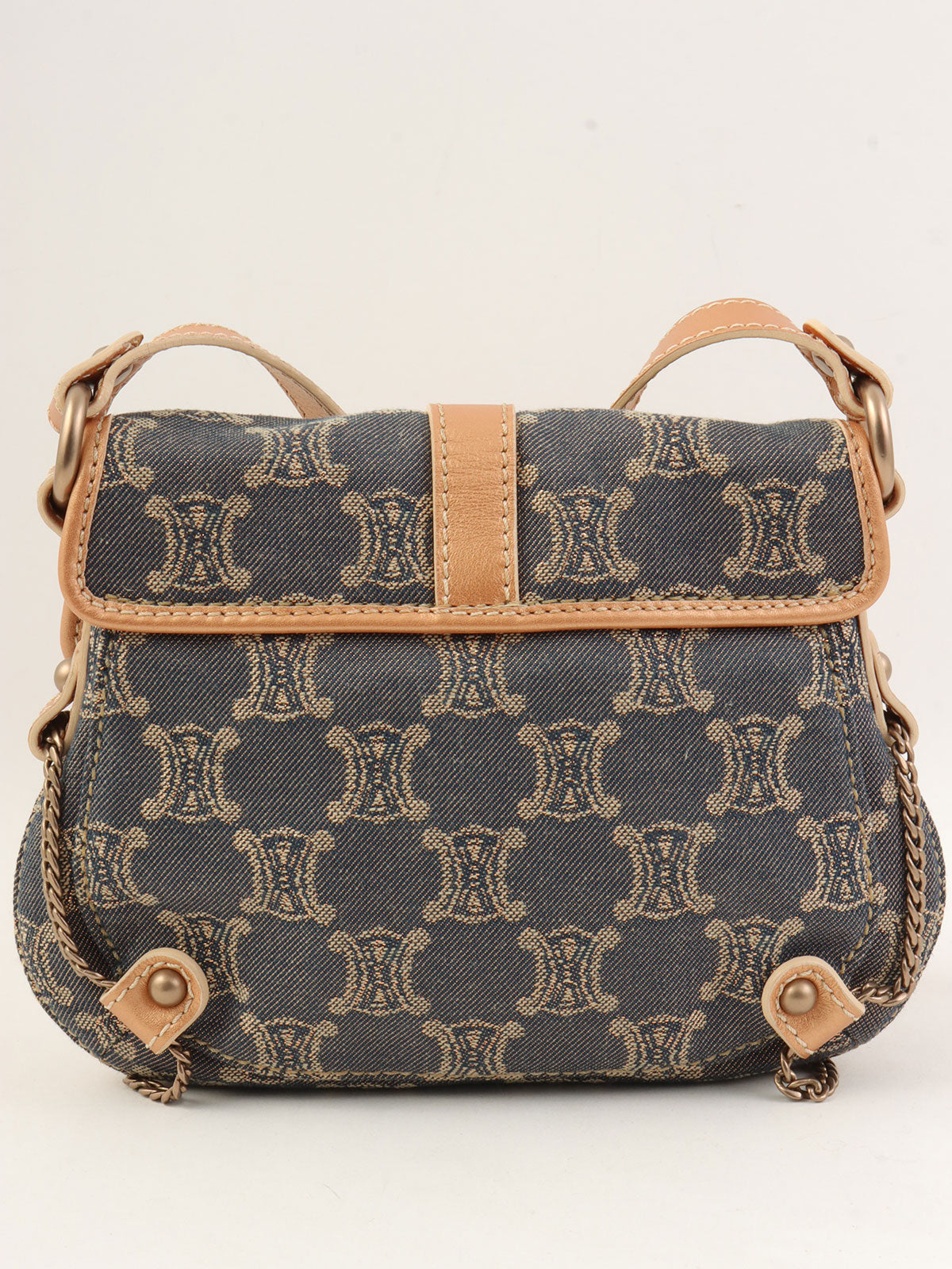 レザーデニムコンビラメマカダムパターンショルダーバッグ ブロンズ/ブルー