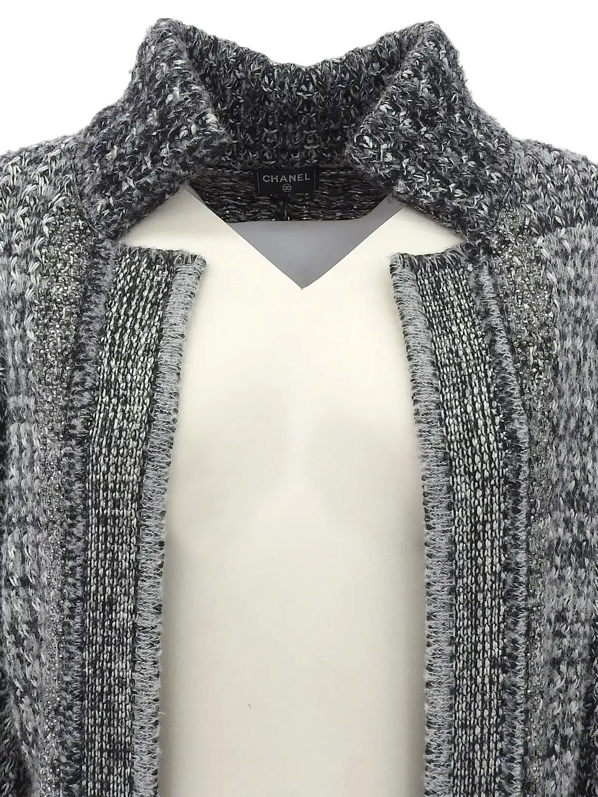 ラインストーンCCマークボタンチェーンデザインニットジャケット グレー/ホワイト