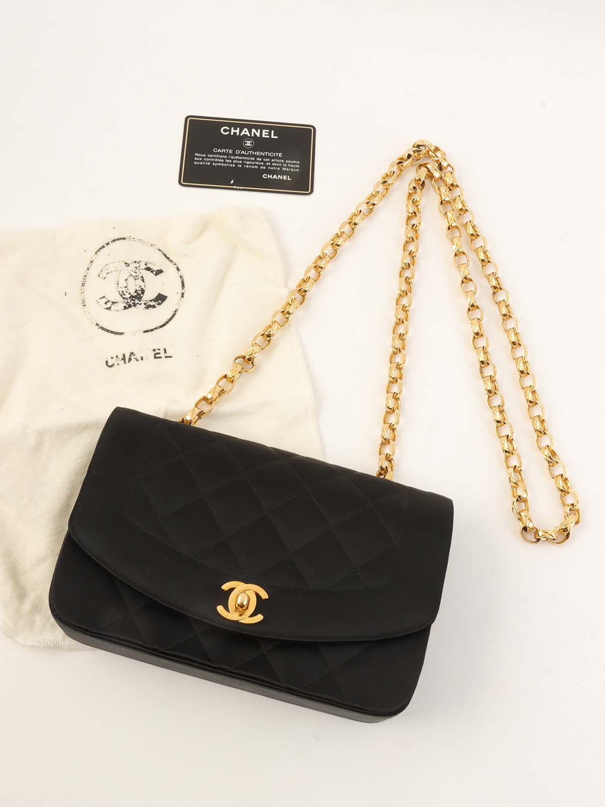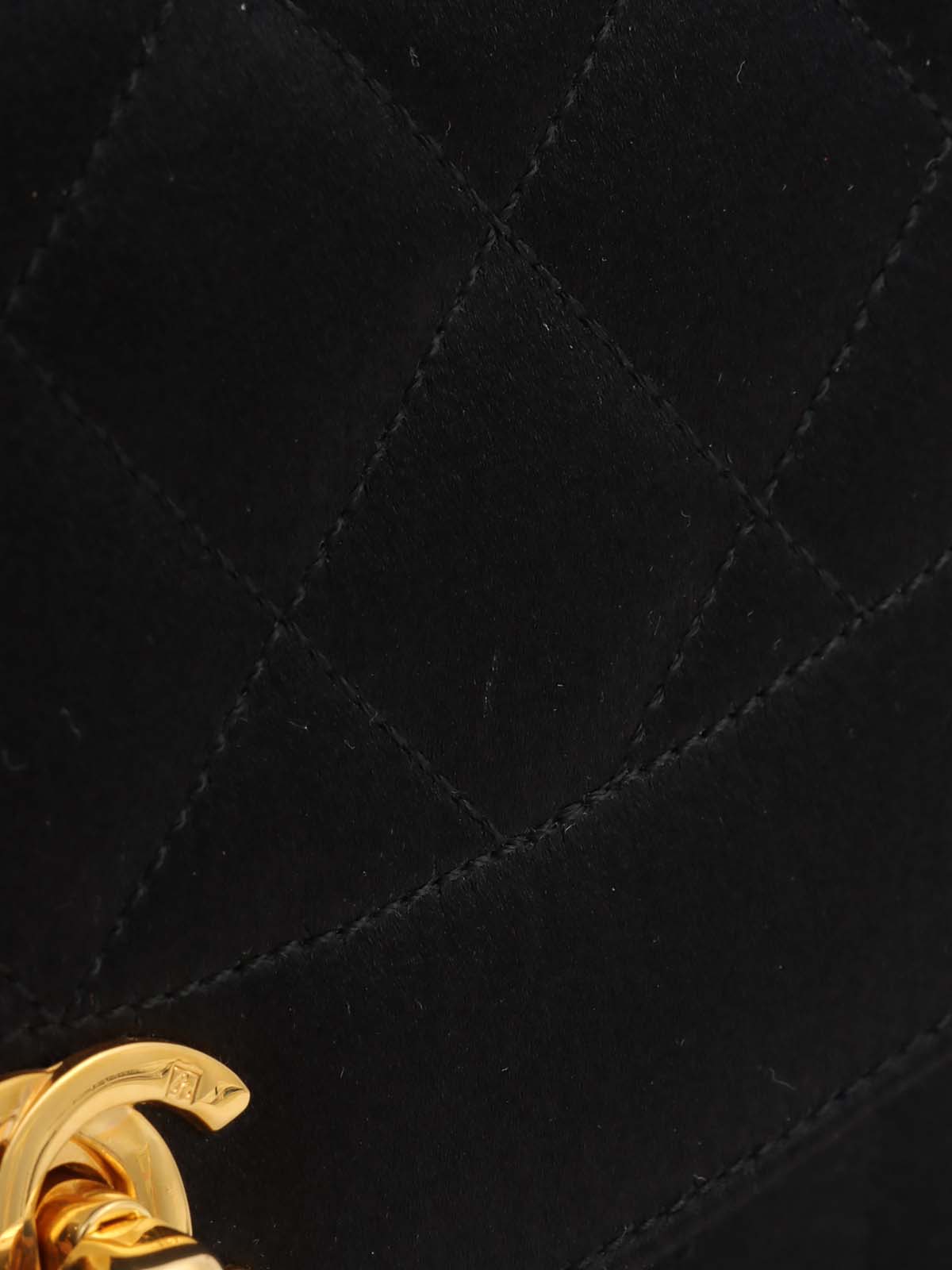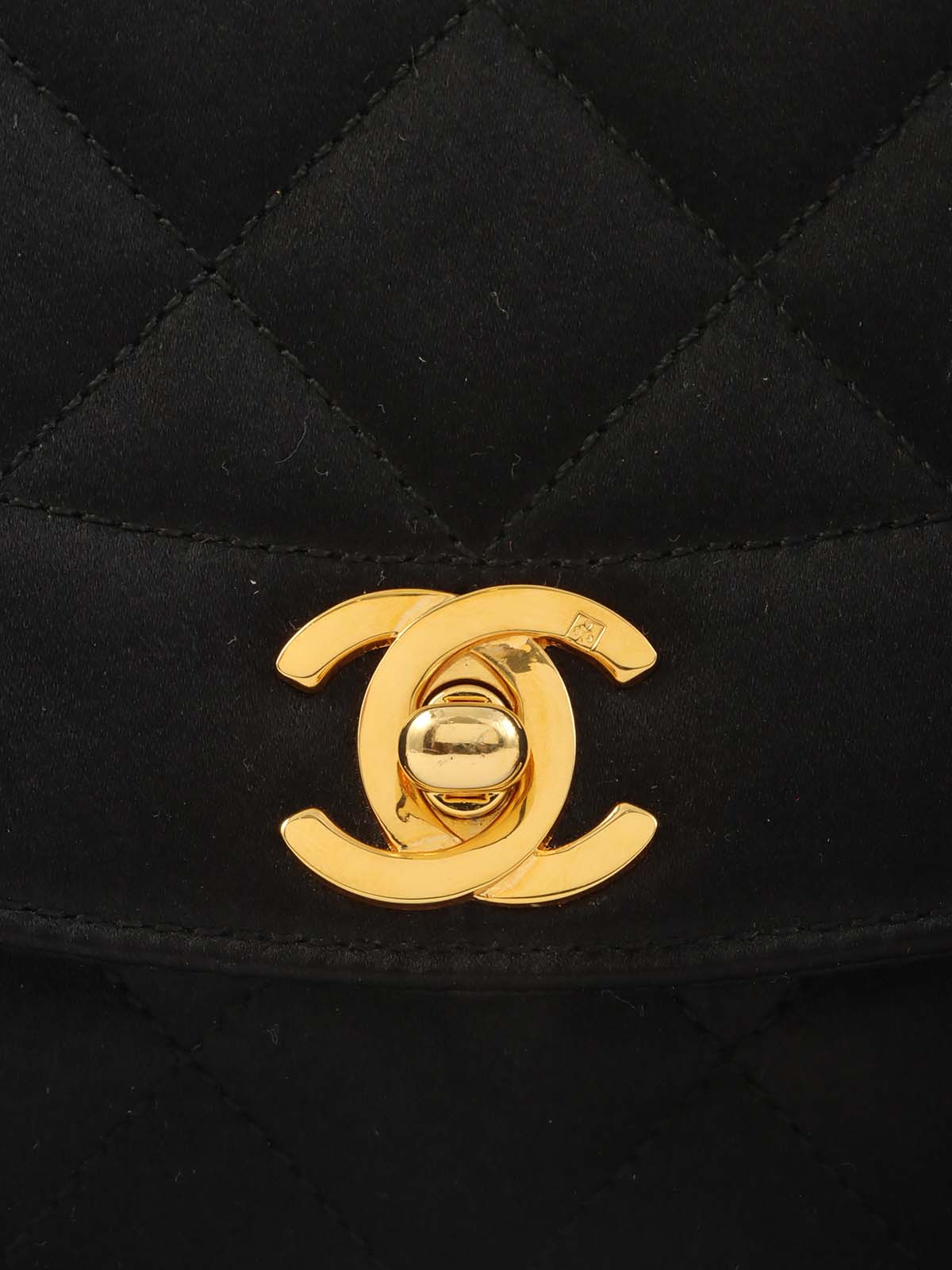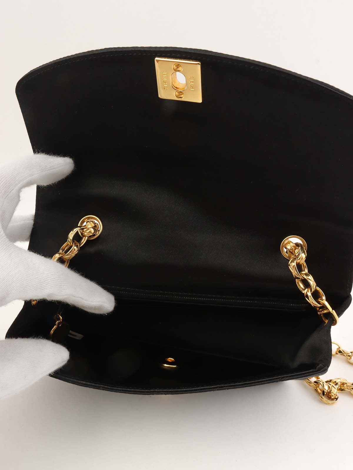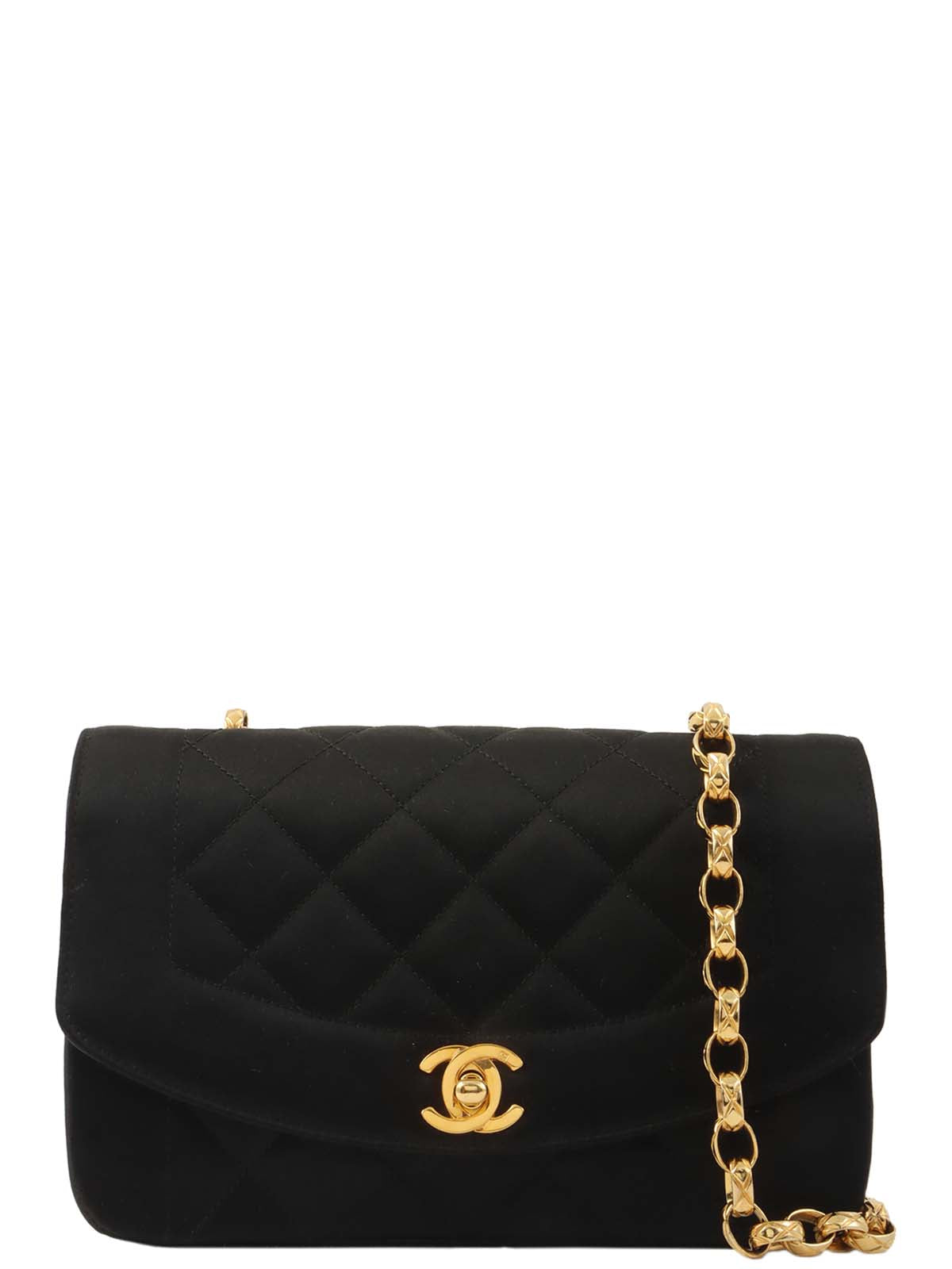 1990年頃製 サテンダイアナフラップビジューチェーンショルダーバッグ20cm ブラック