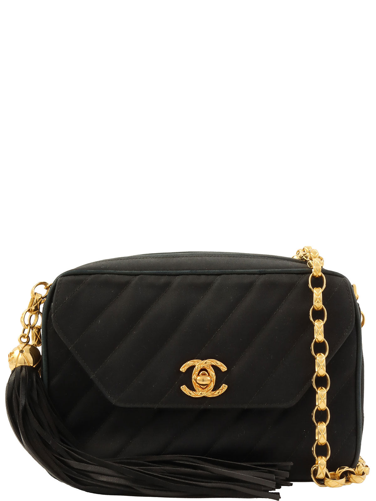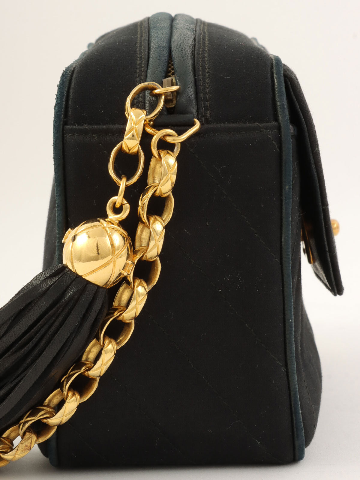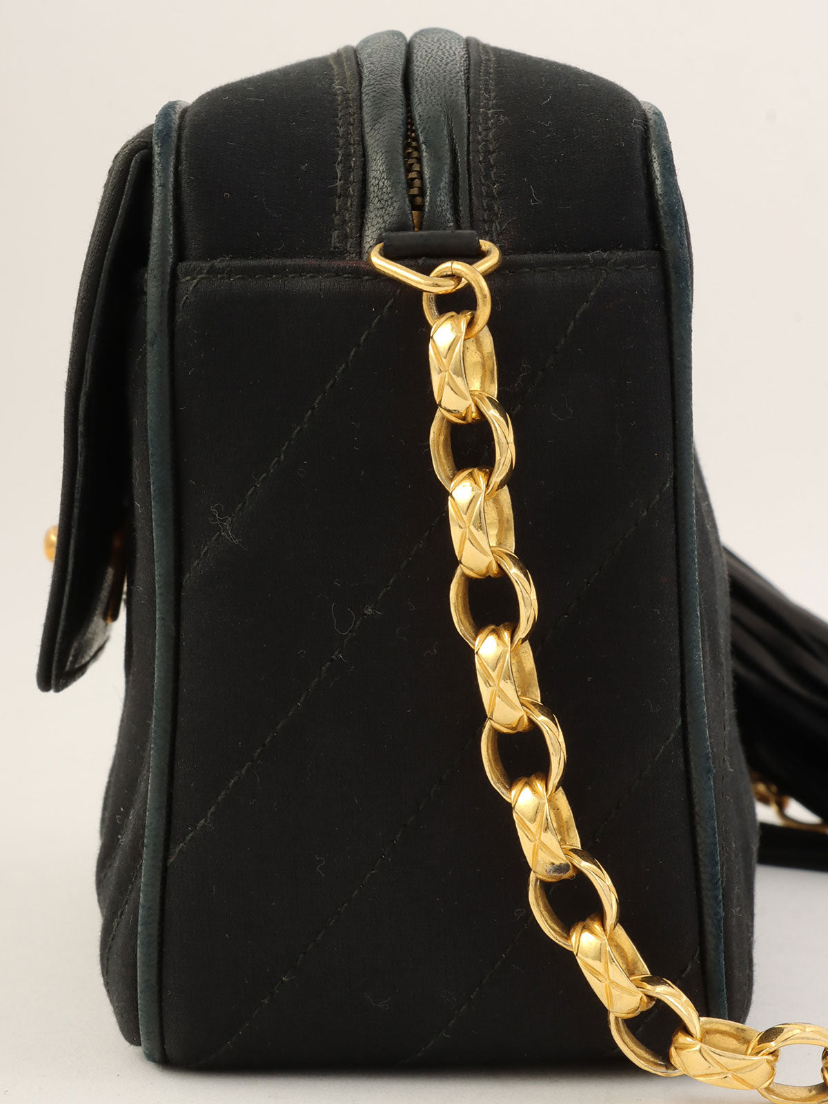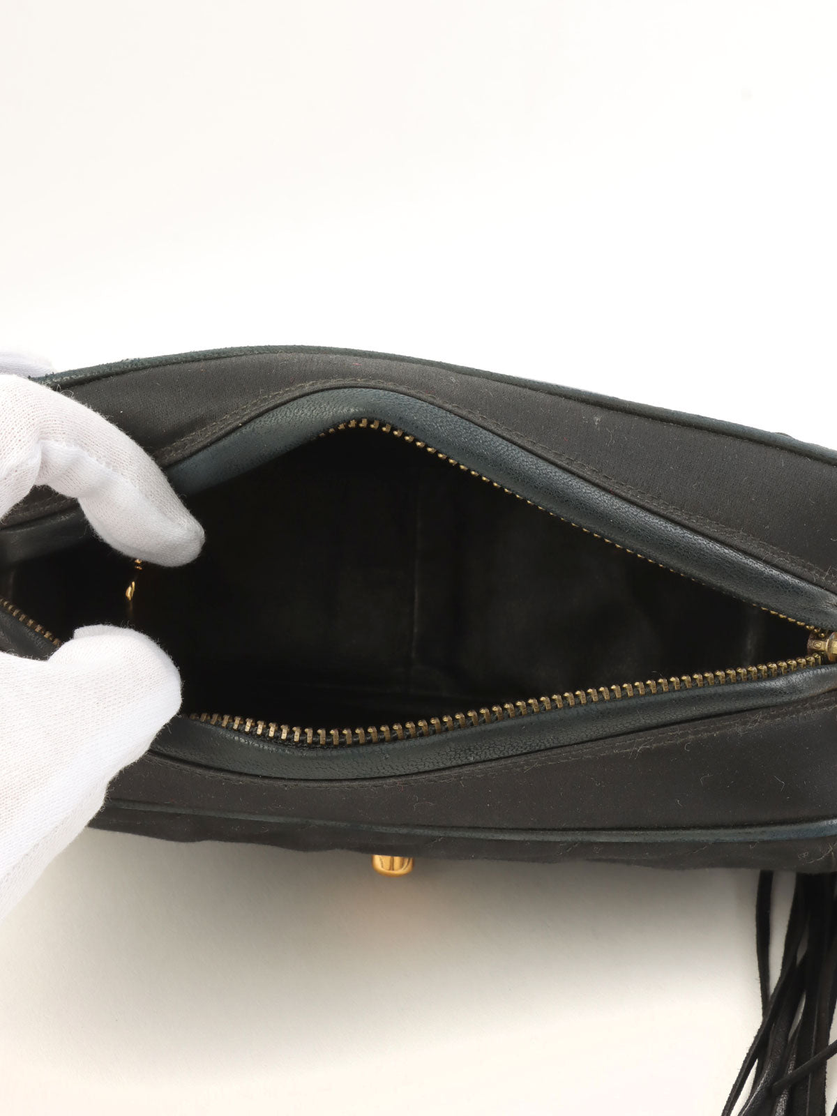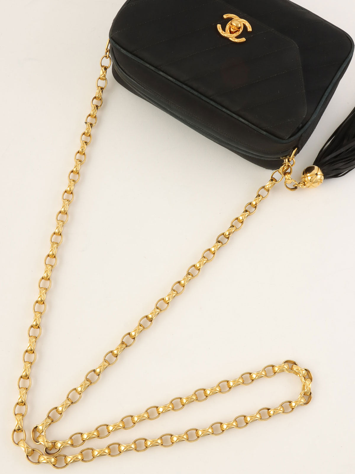 1992年製 サテンCCターンロックフリンジチェーンショルダーバッグ ブラック