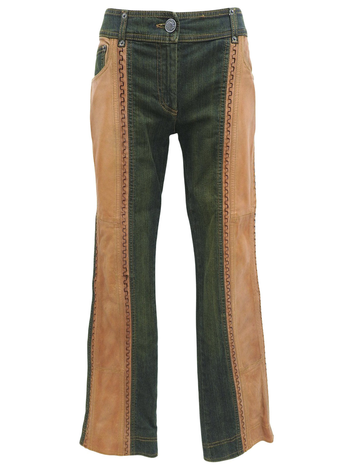 レザーパッチワークロゴボタンデニムパンツ インディゴ/ブラウン