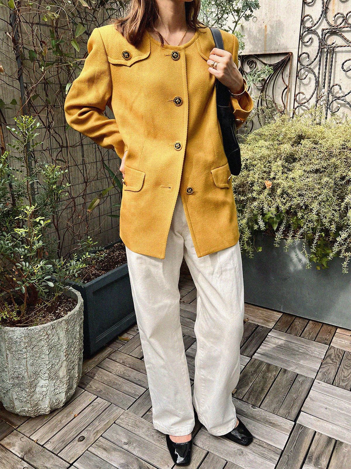 ウールデザインロゴボタンノーカラージャケット マスタード