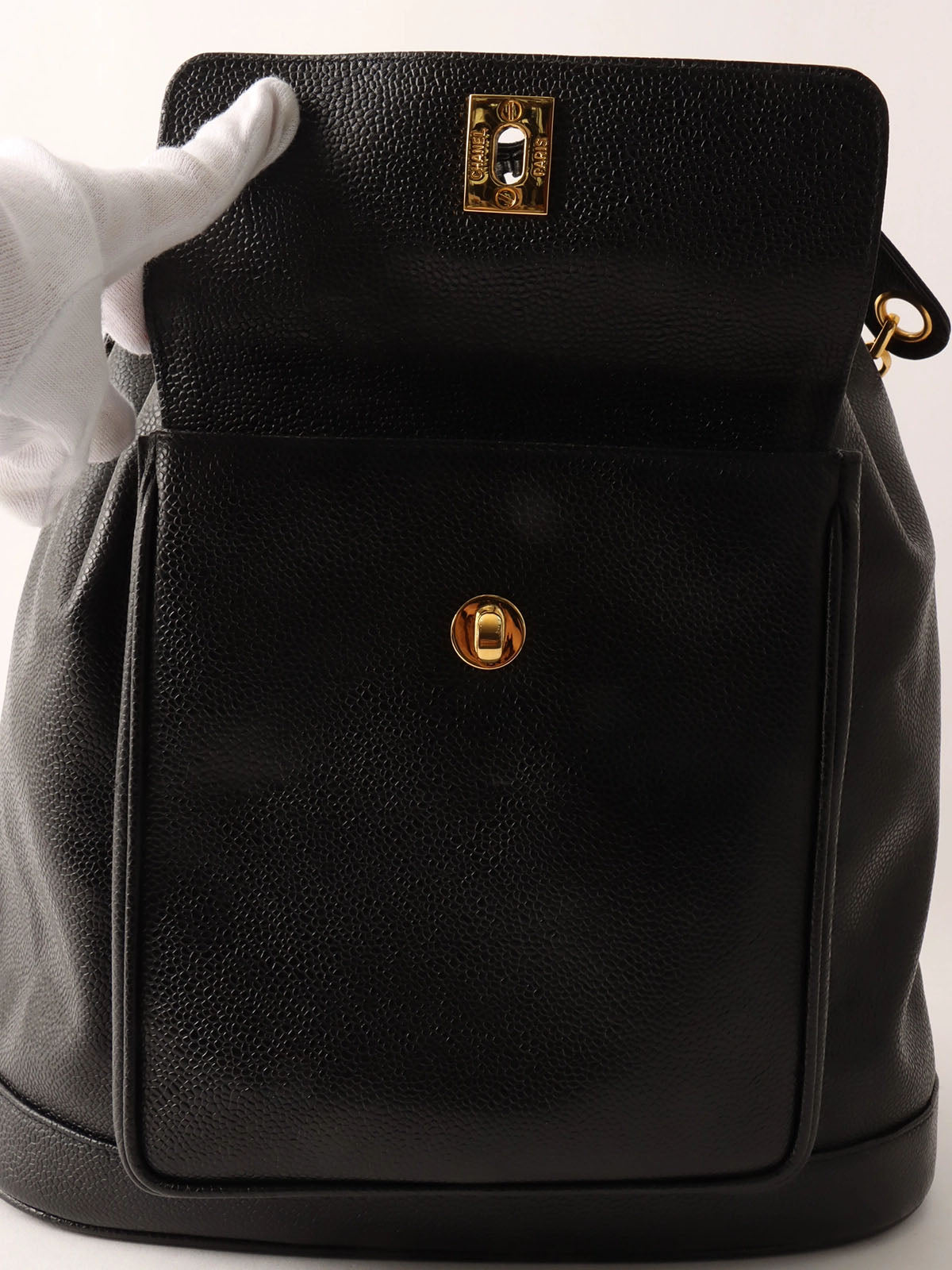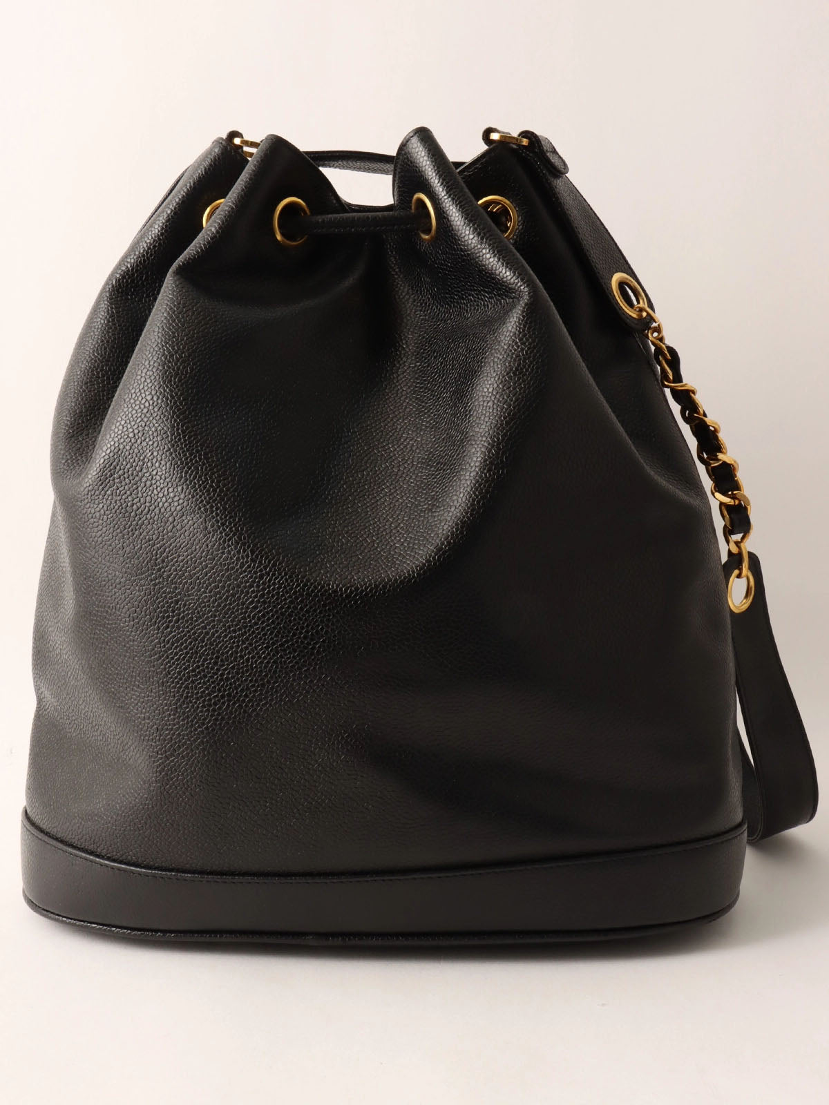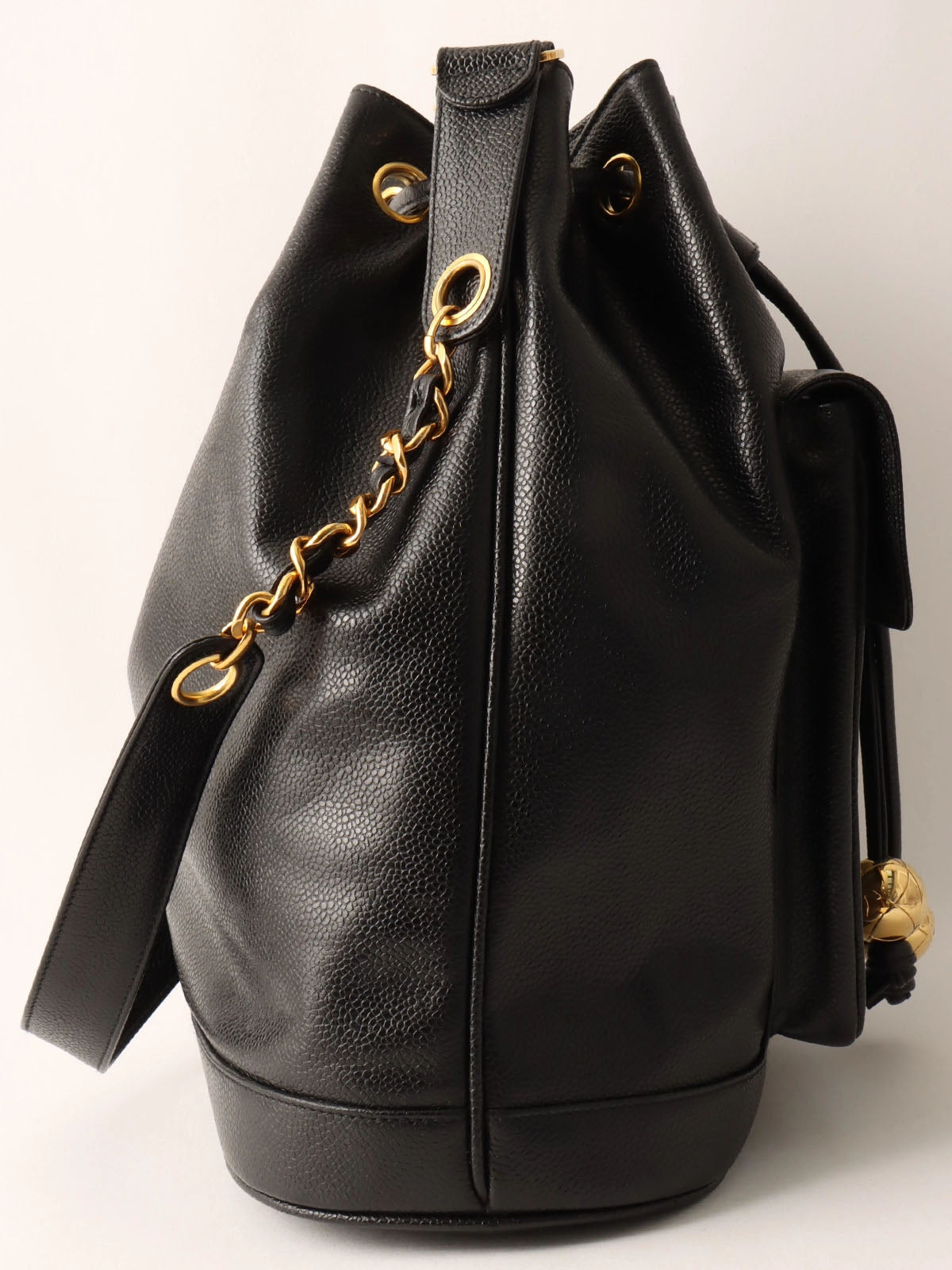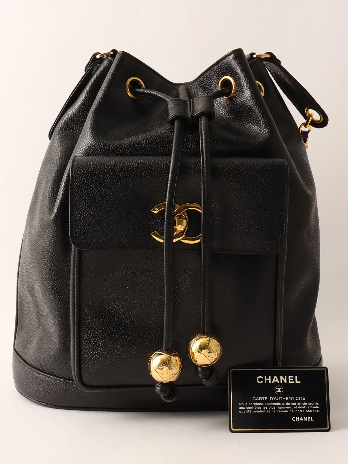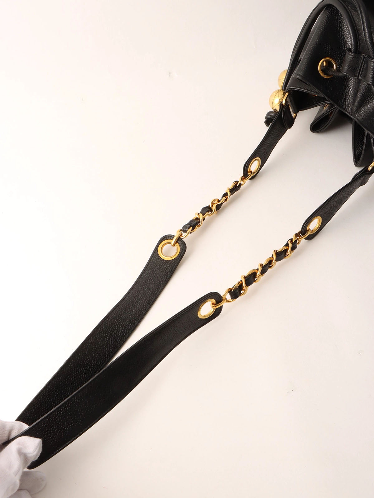 1995年頃製 キャビアスキンCCターンロックプレートポーチ付き巾着ショルダーバッグ ブラック
