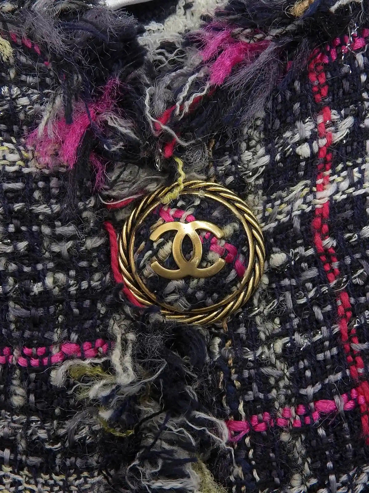 2007年製 ツイードCCマークノーカラーロングジャケット ネイビー/ピンク/マルチ