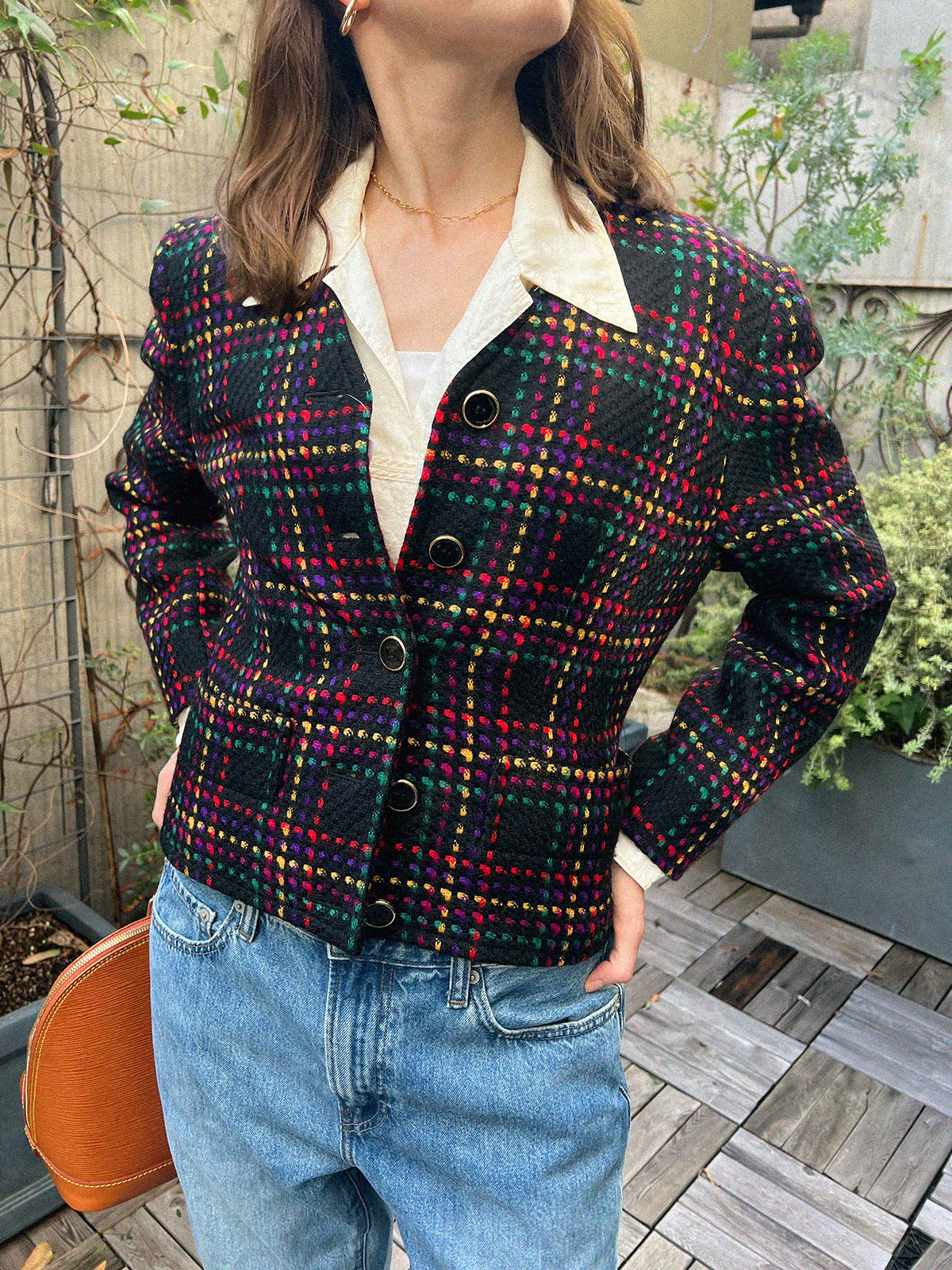 ウールチェックパターンノーカラージャケット ブラック/マルチ