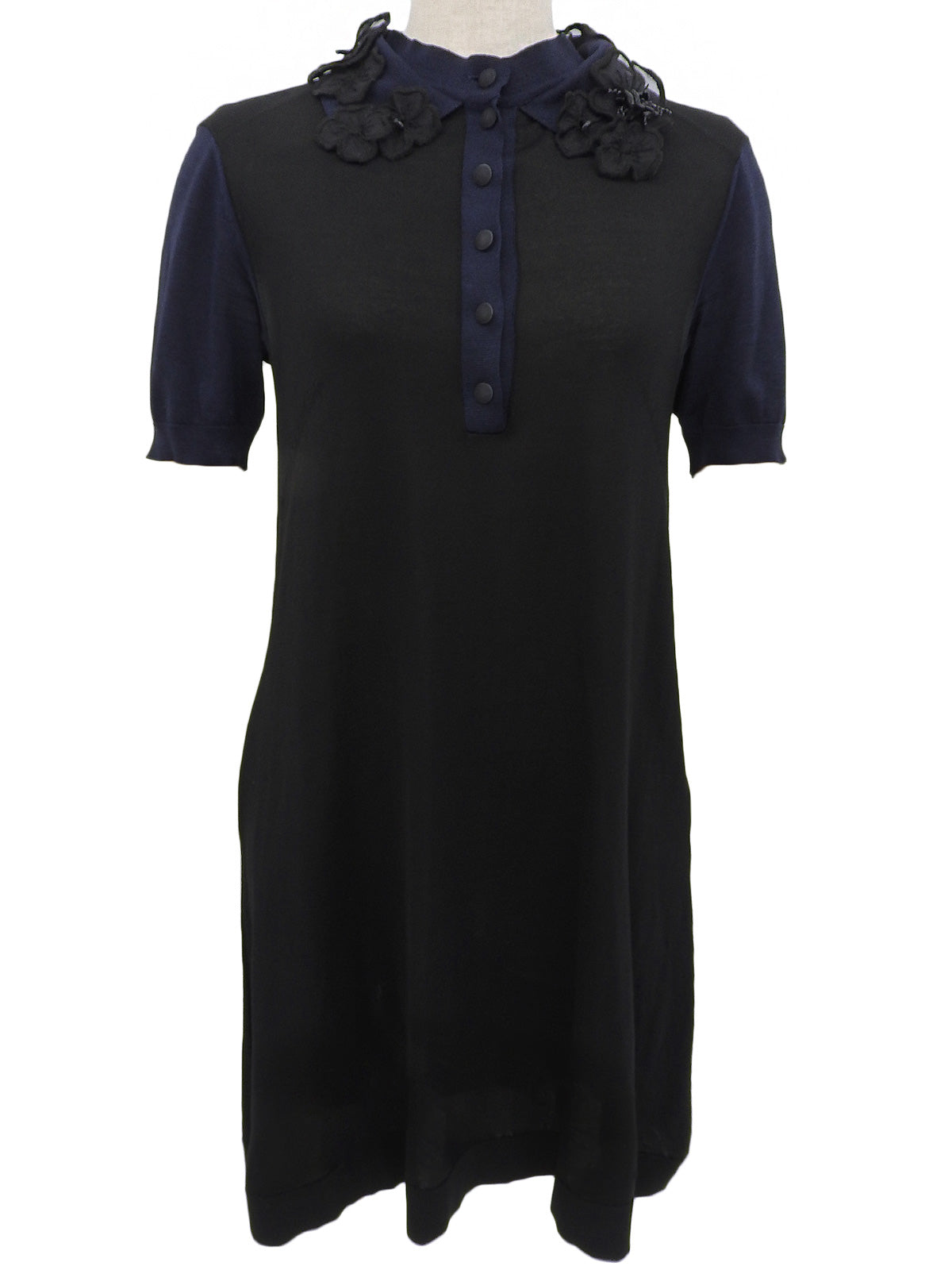 シルクフラワーモチーフ半袖シャツワンピース ブラック/ネイビー
