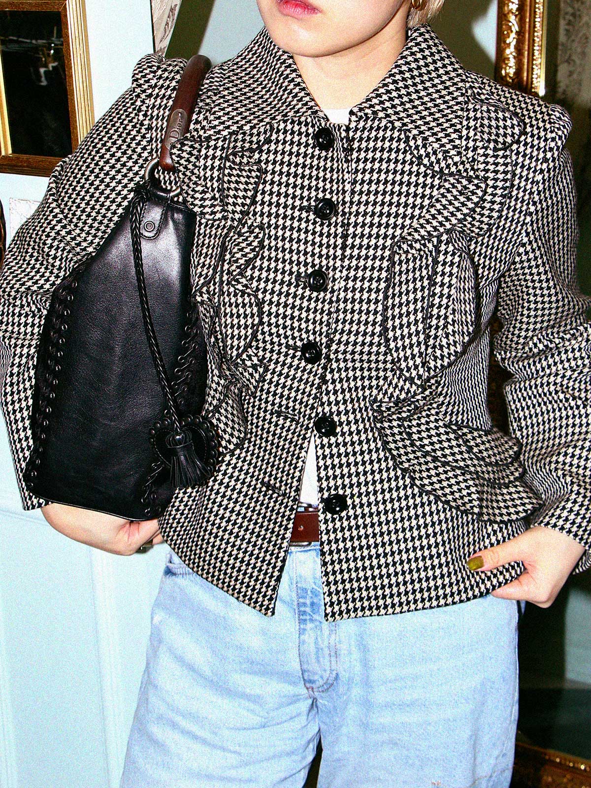 ウールハウンドトゥースパターンフリルジャケット ブラック/マルチ