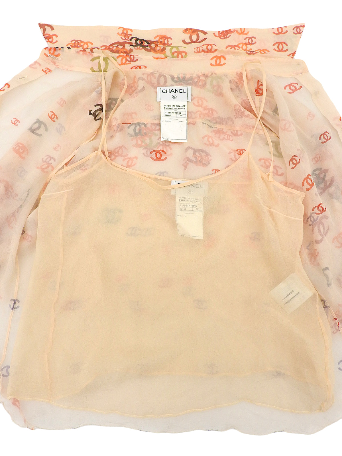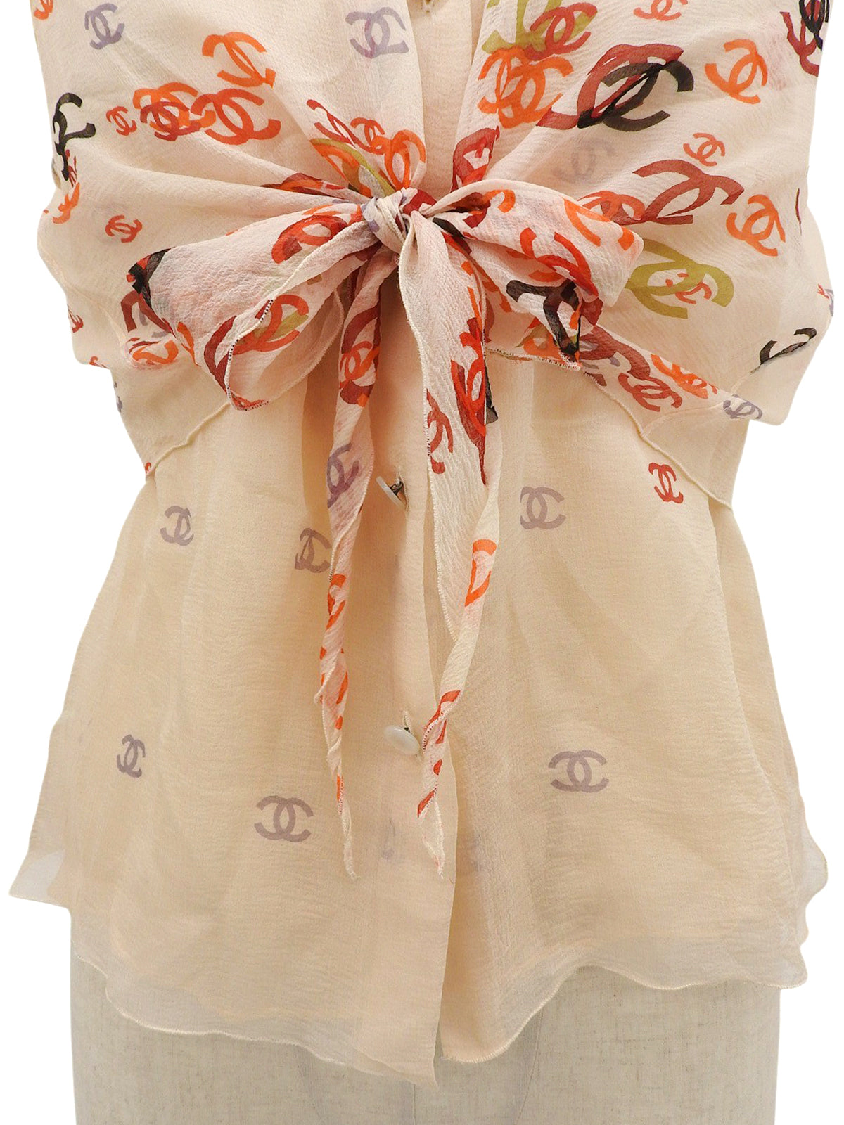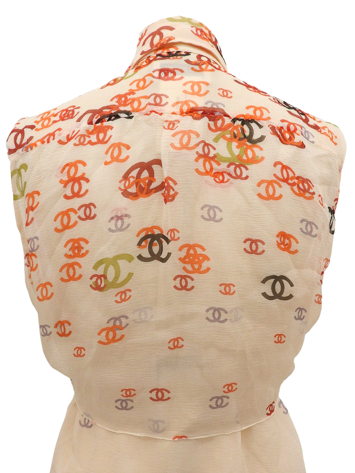 2001年製 シルクCCマークパターンシースルーノースリーブブラウス オレンジ/ベージュ
