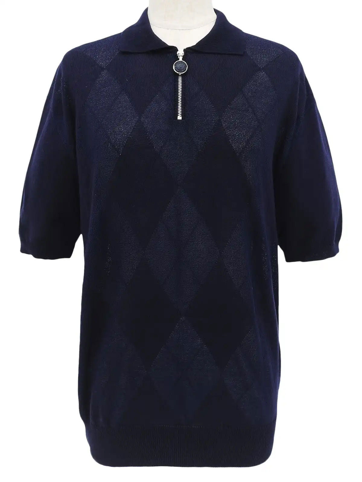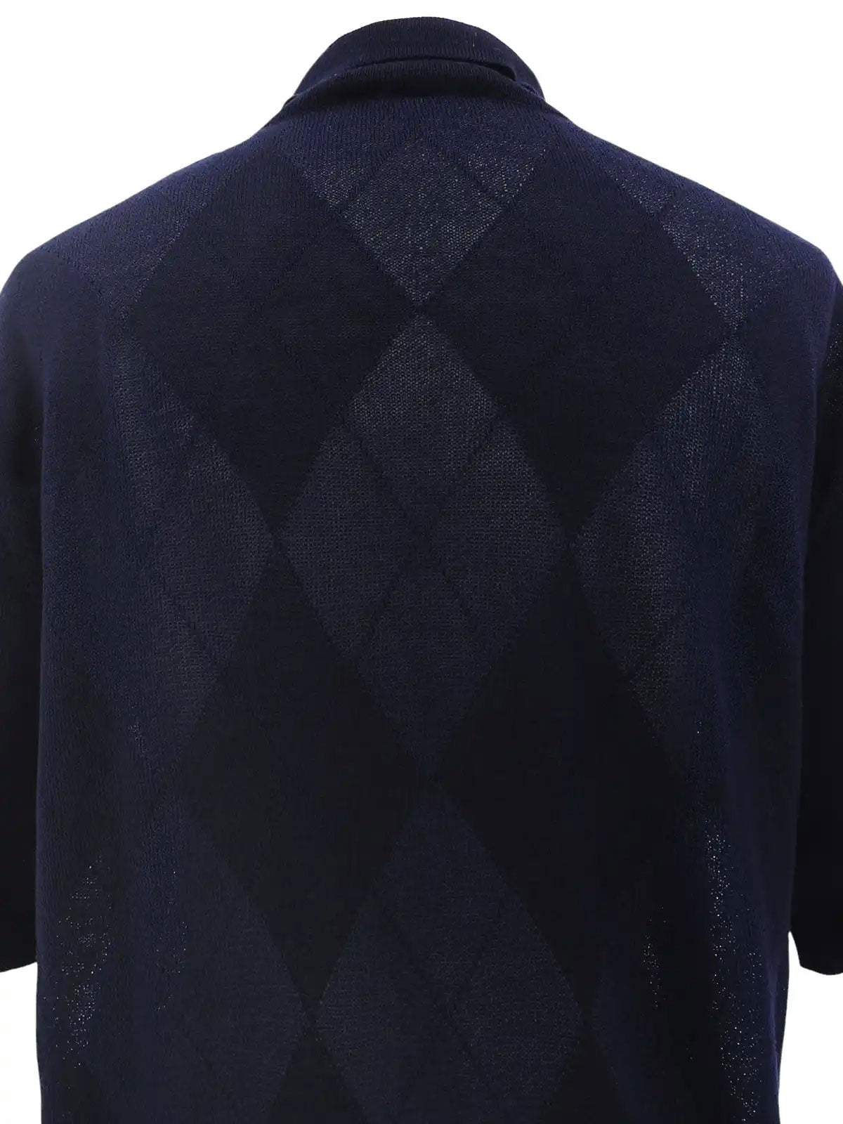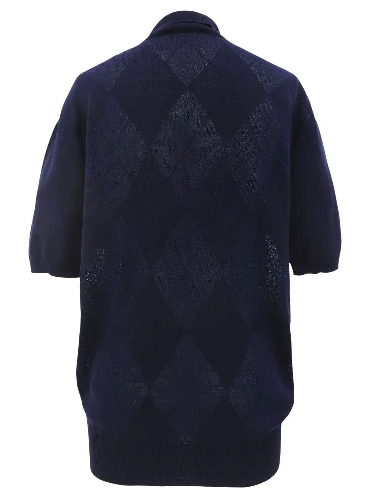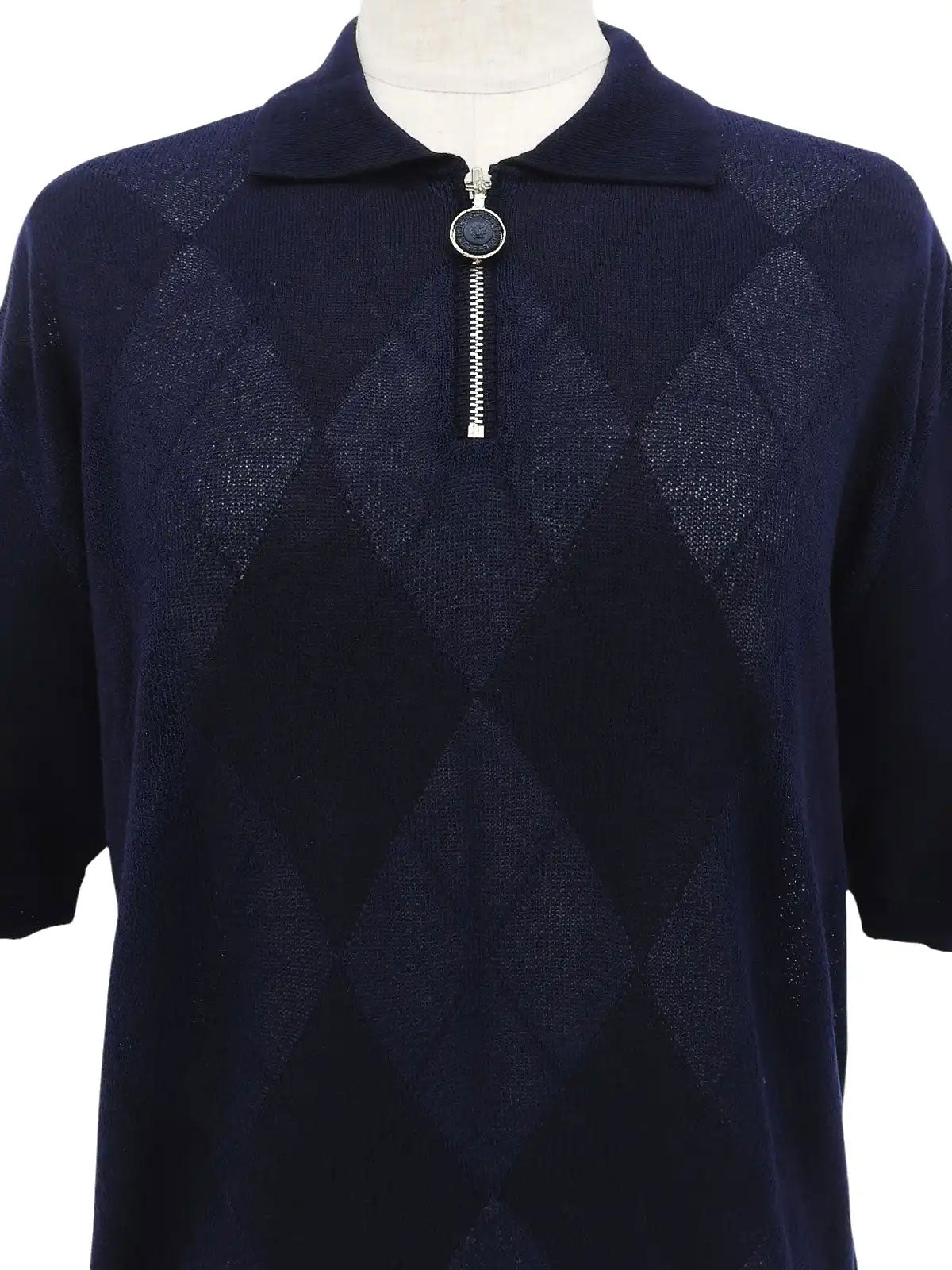 Argyle Pattern Medusa Zip Half Sleeve Knit Top in Navy