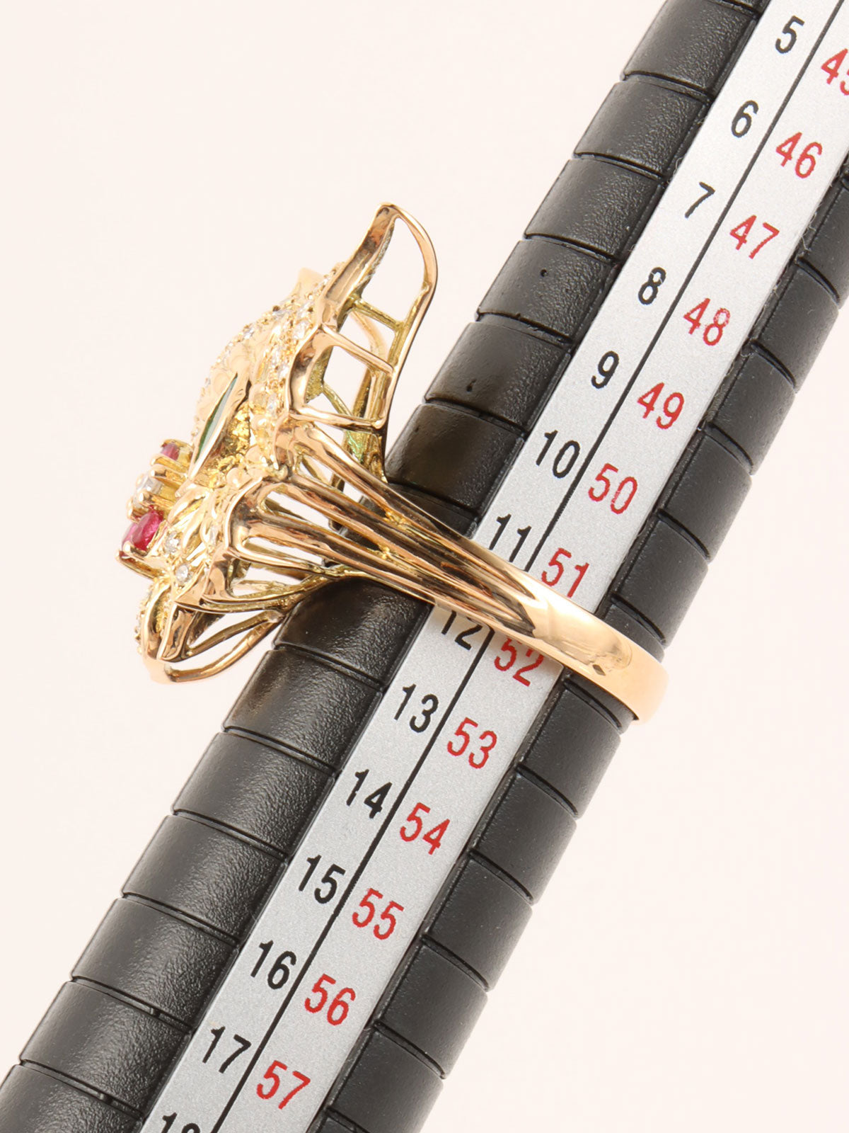 18K Ruby and Diamond Flower and Butterfly Motif Ring in Gold/Green/Red