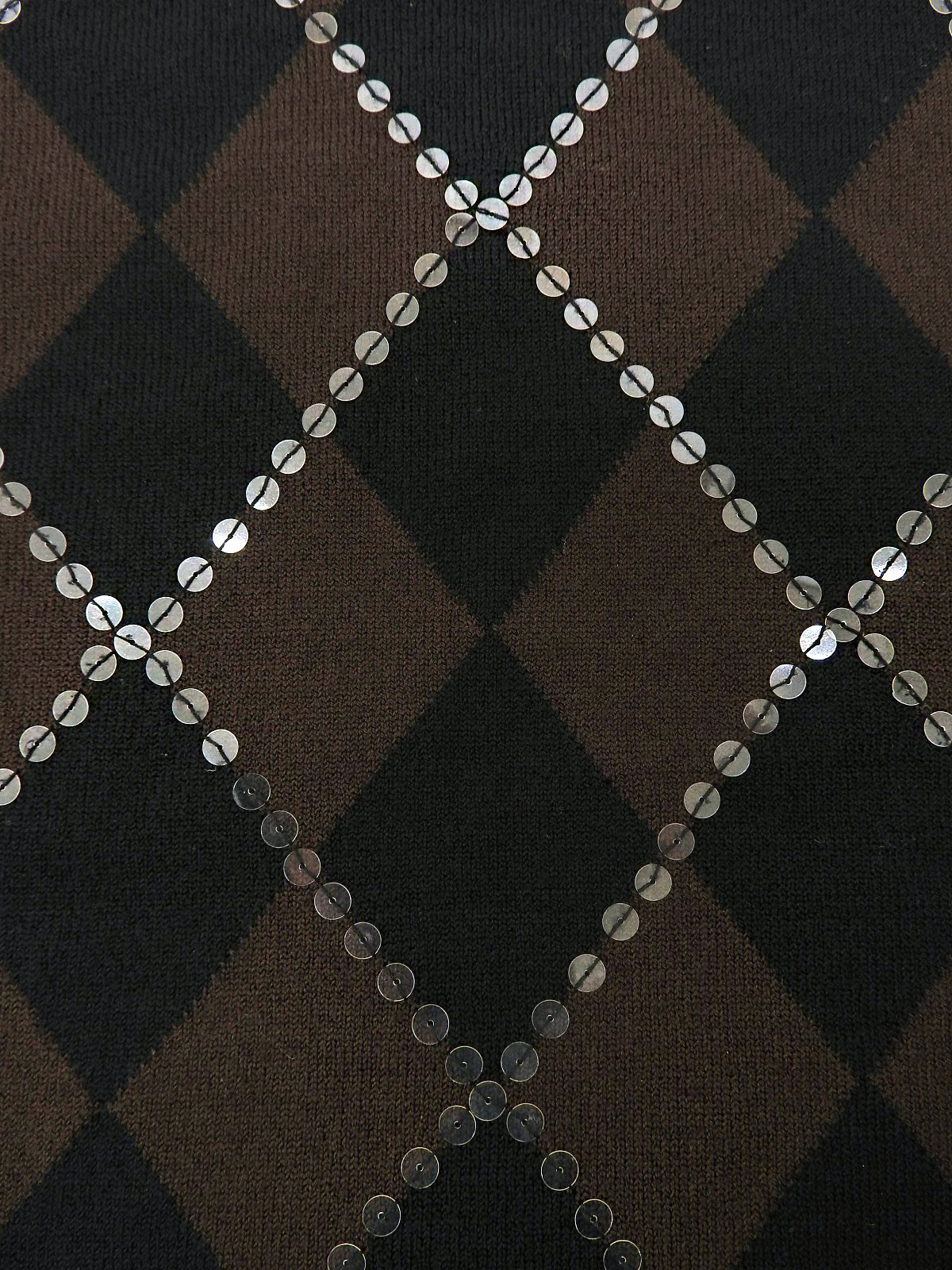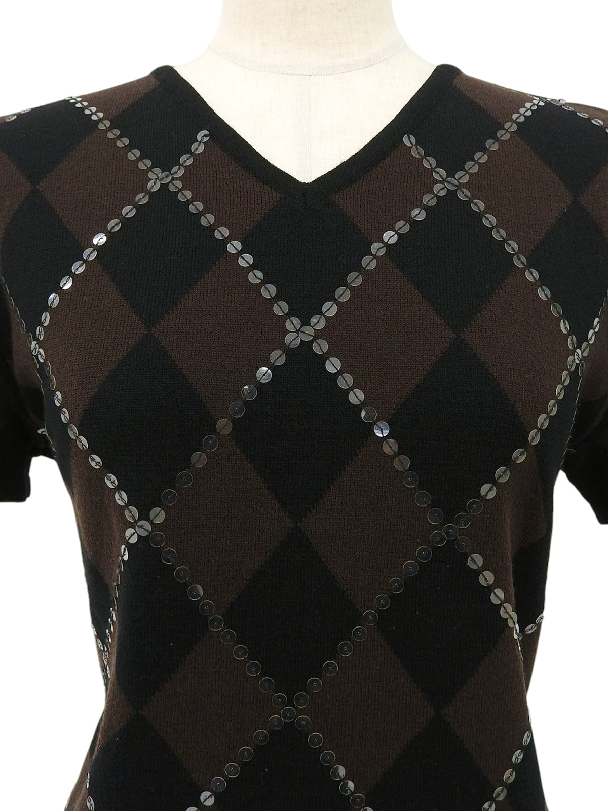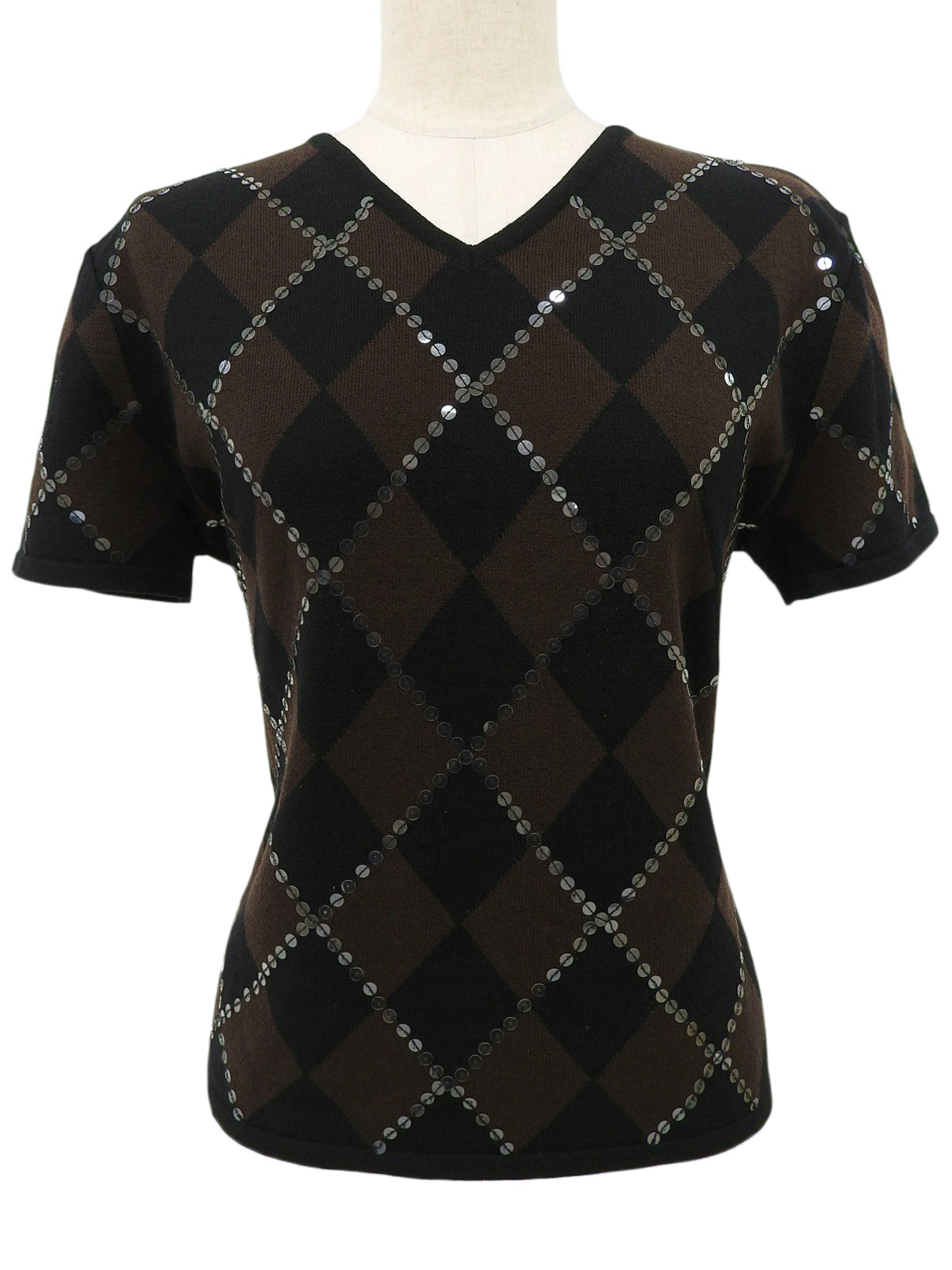 スパンコールアーガイルパターン半袖ニットトップス ブラウン/ブラック