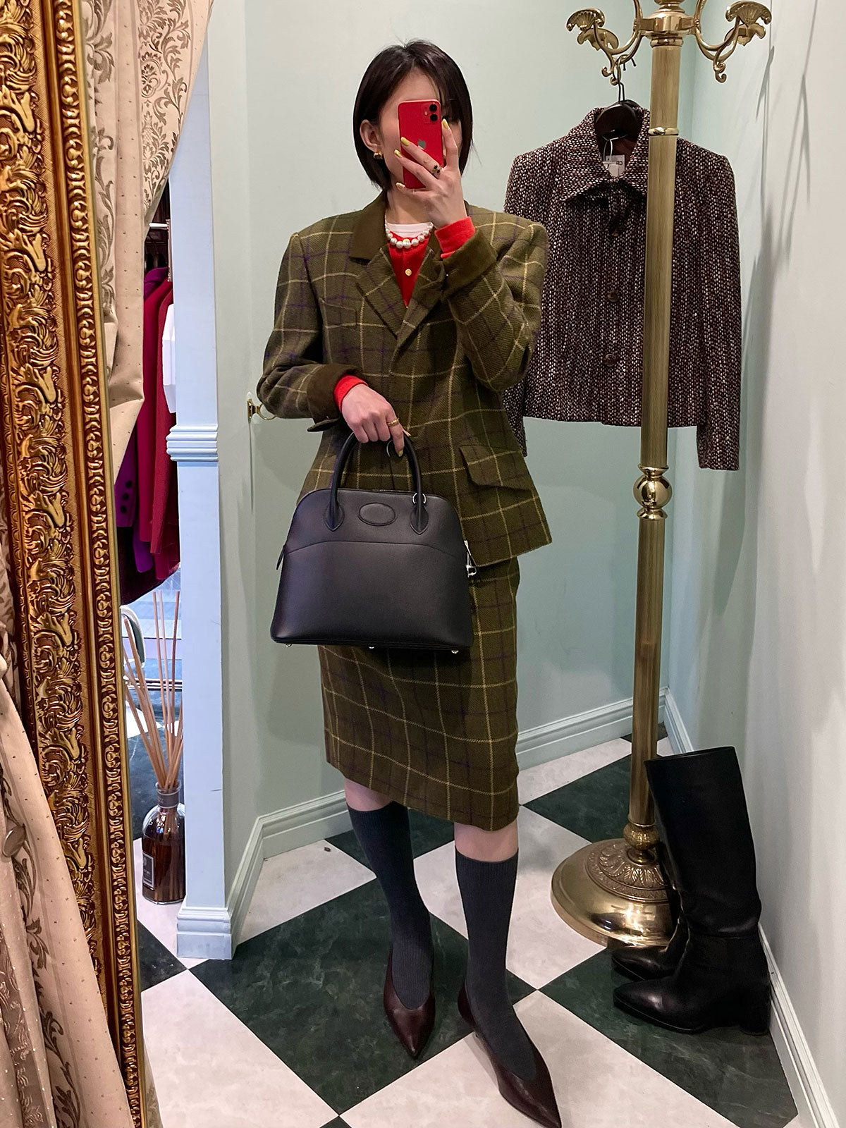 チェックパターンロゴボタンセットアップ カーキ/イエロー/パープル