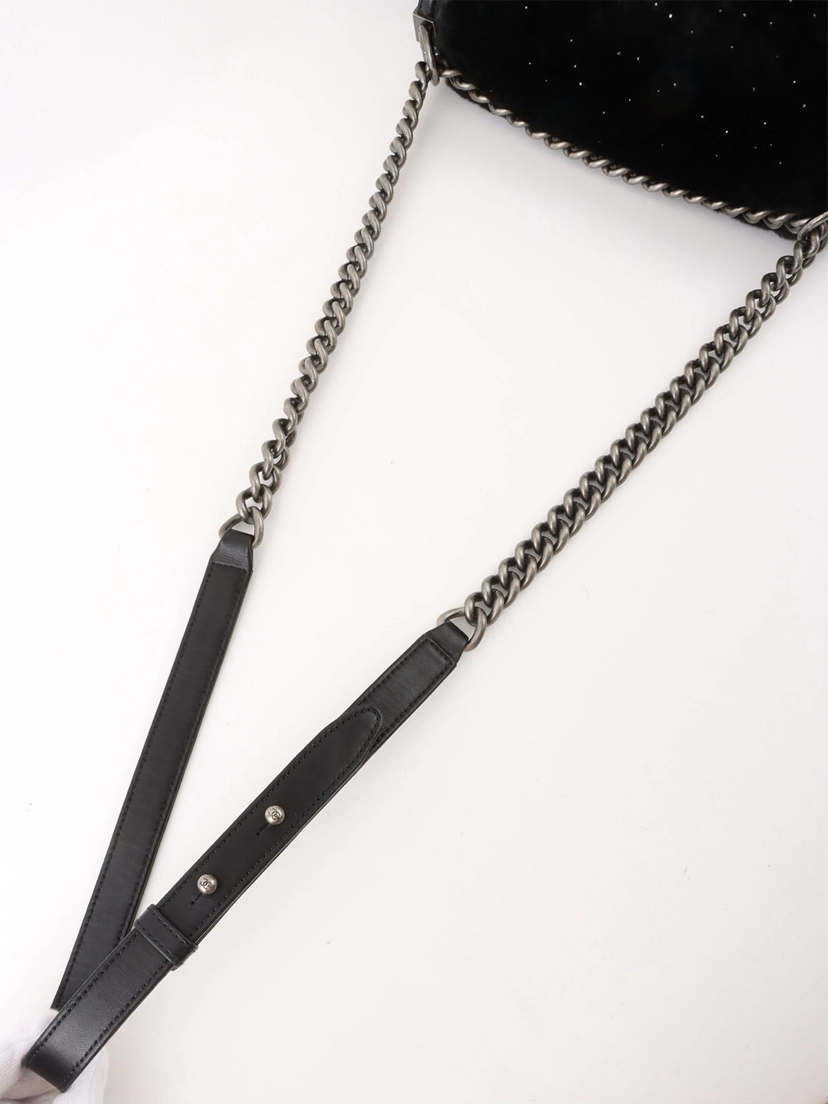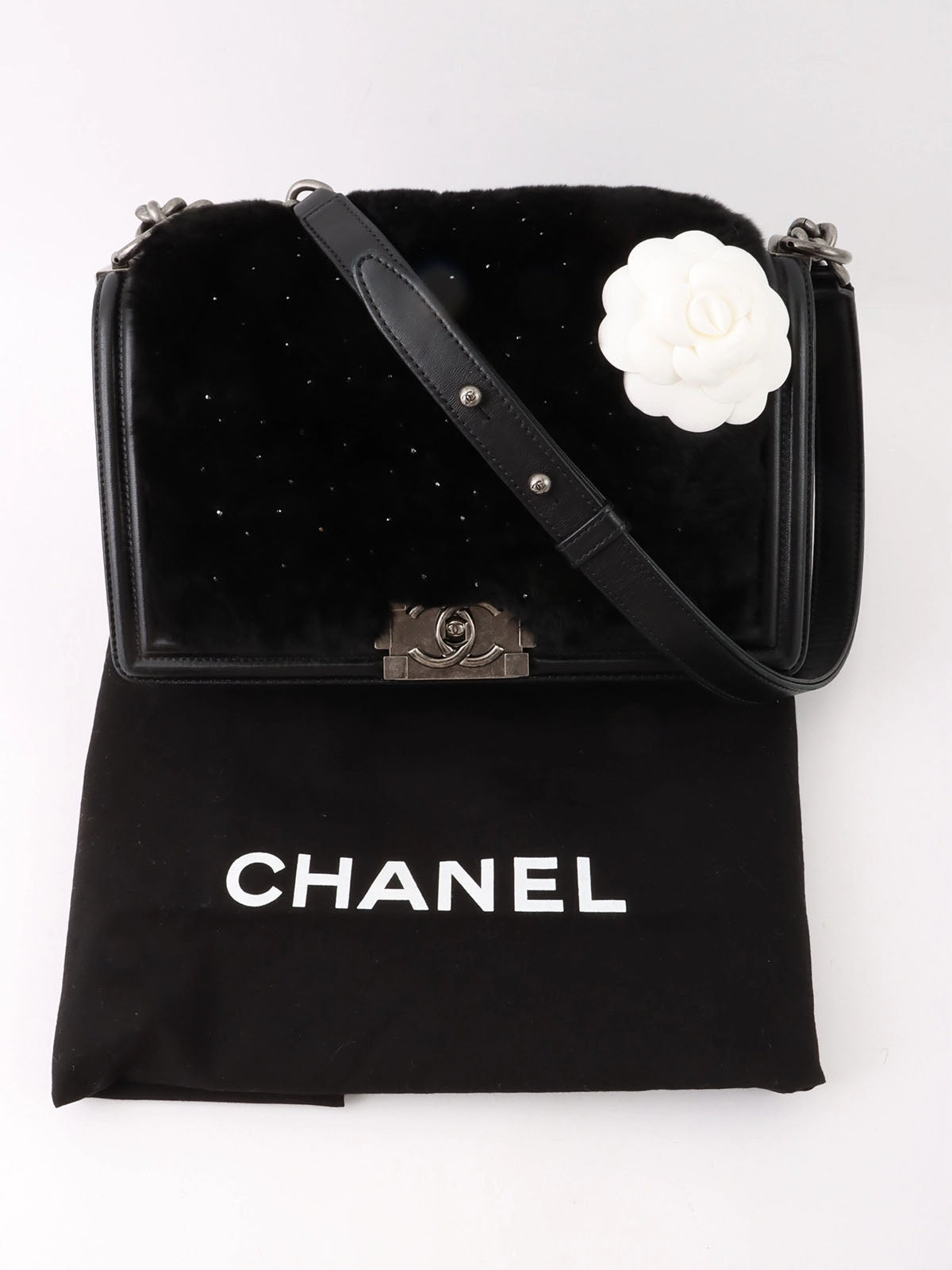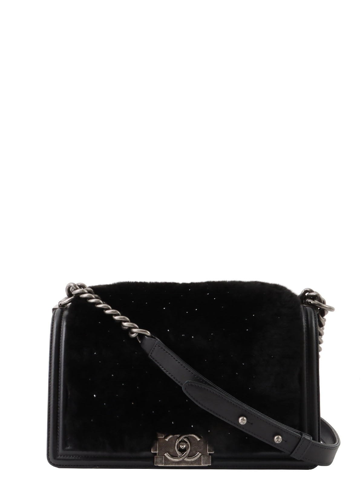 2015 水钻皮毛皮革组合男孩 Chanel 链条单肩包黑色