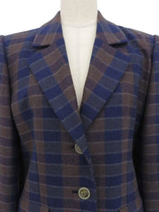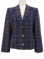 棕色/蓝色羊毛格纹徽标纽扣夹克