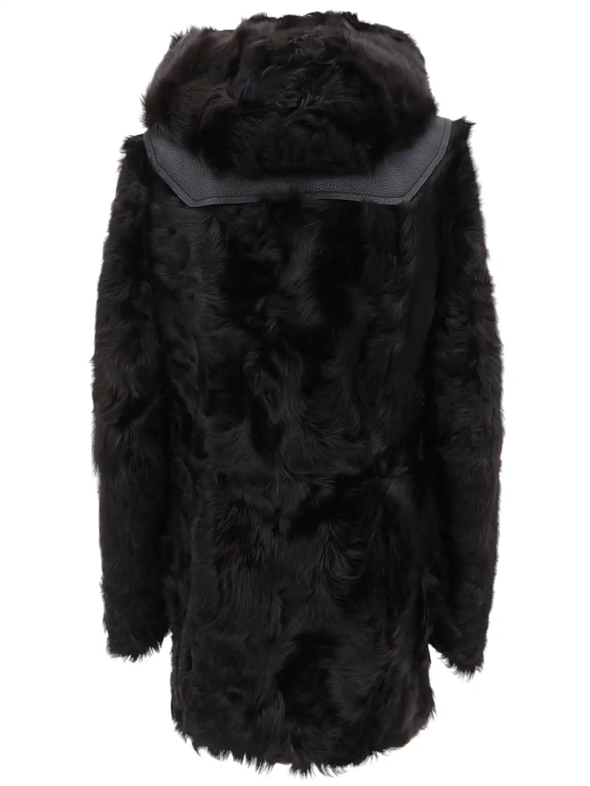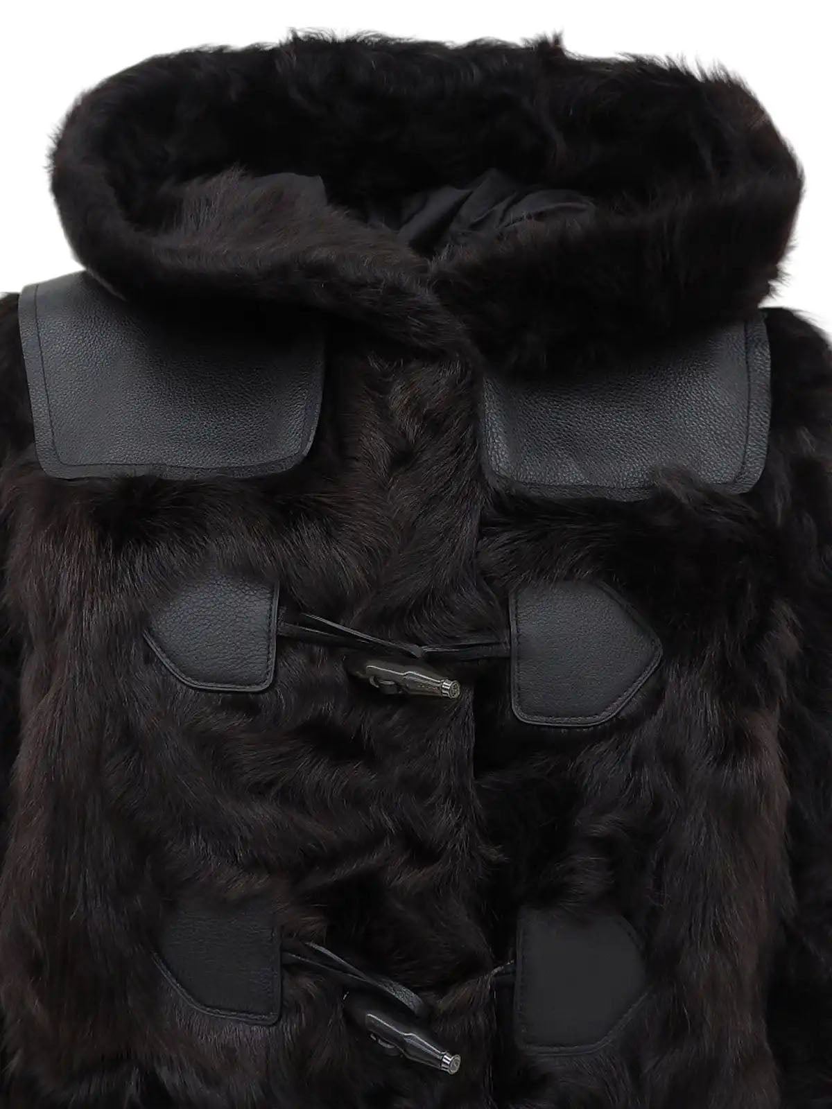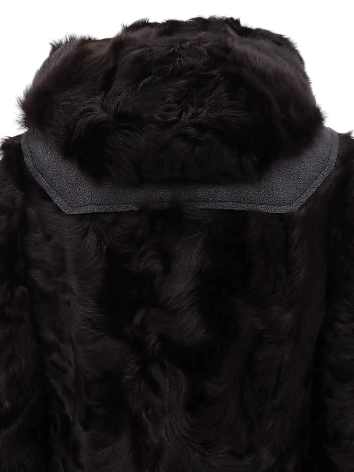 深棕色/黑色毛皮和皮革组合粗呢大衣
