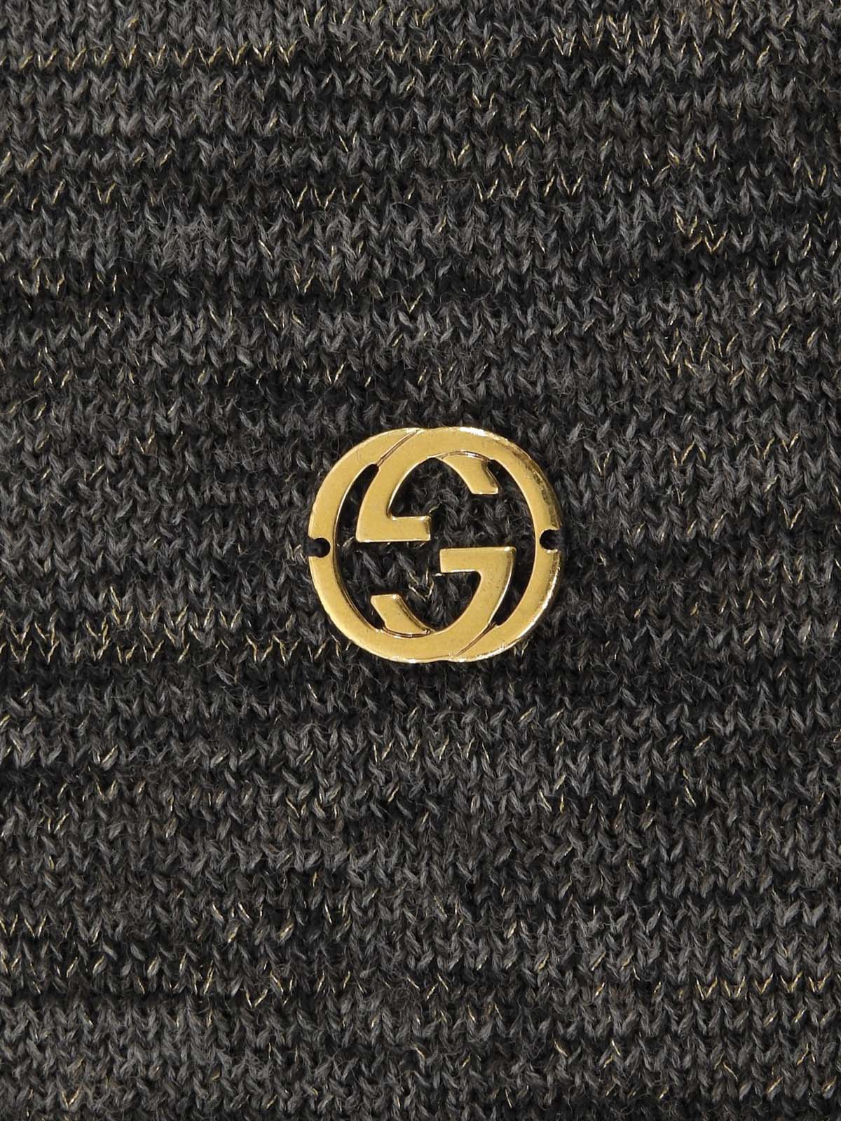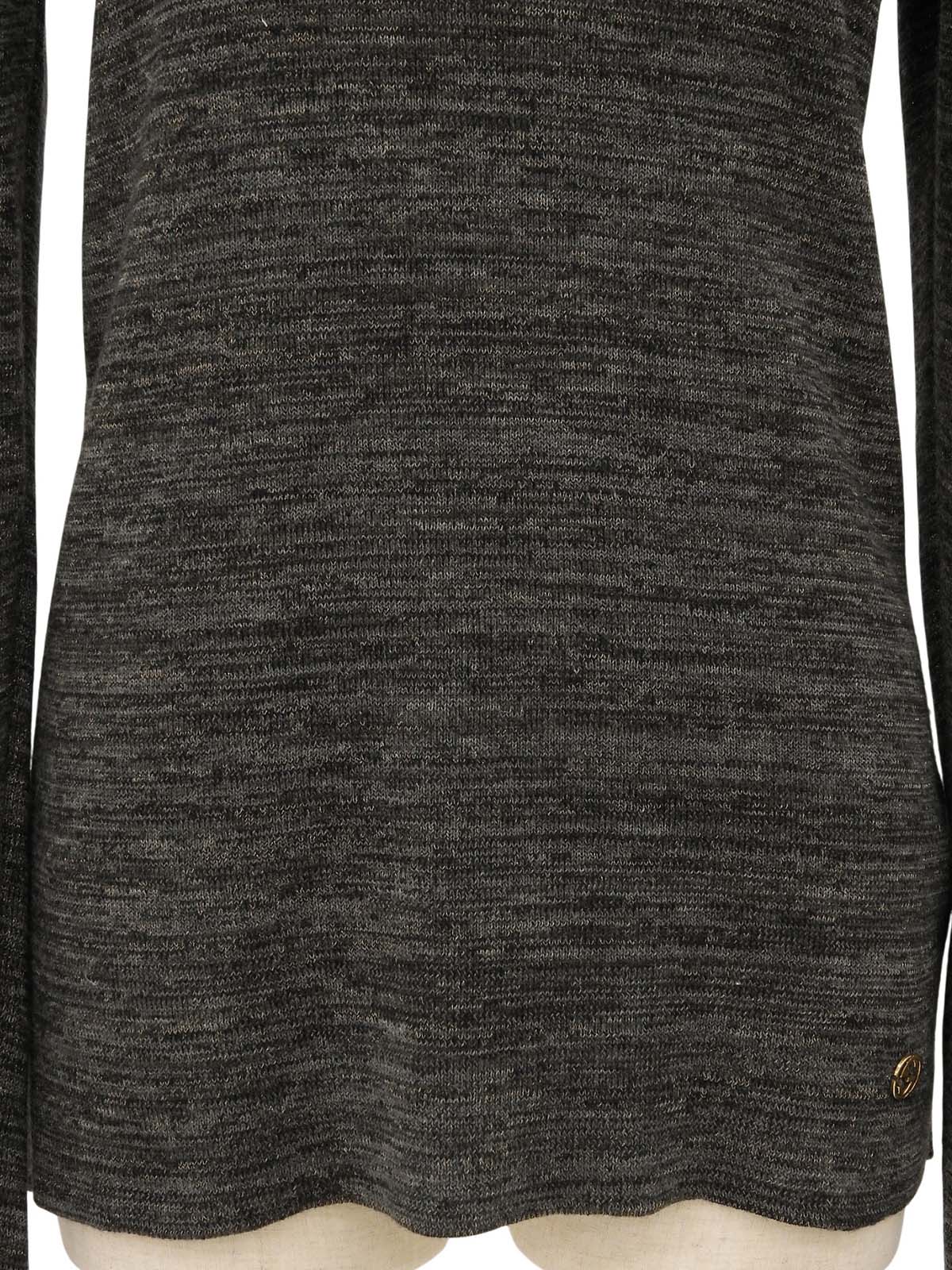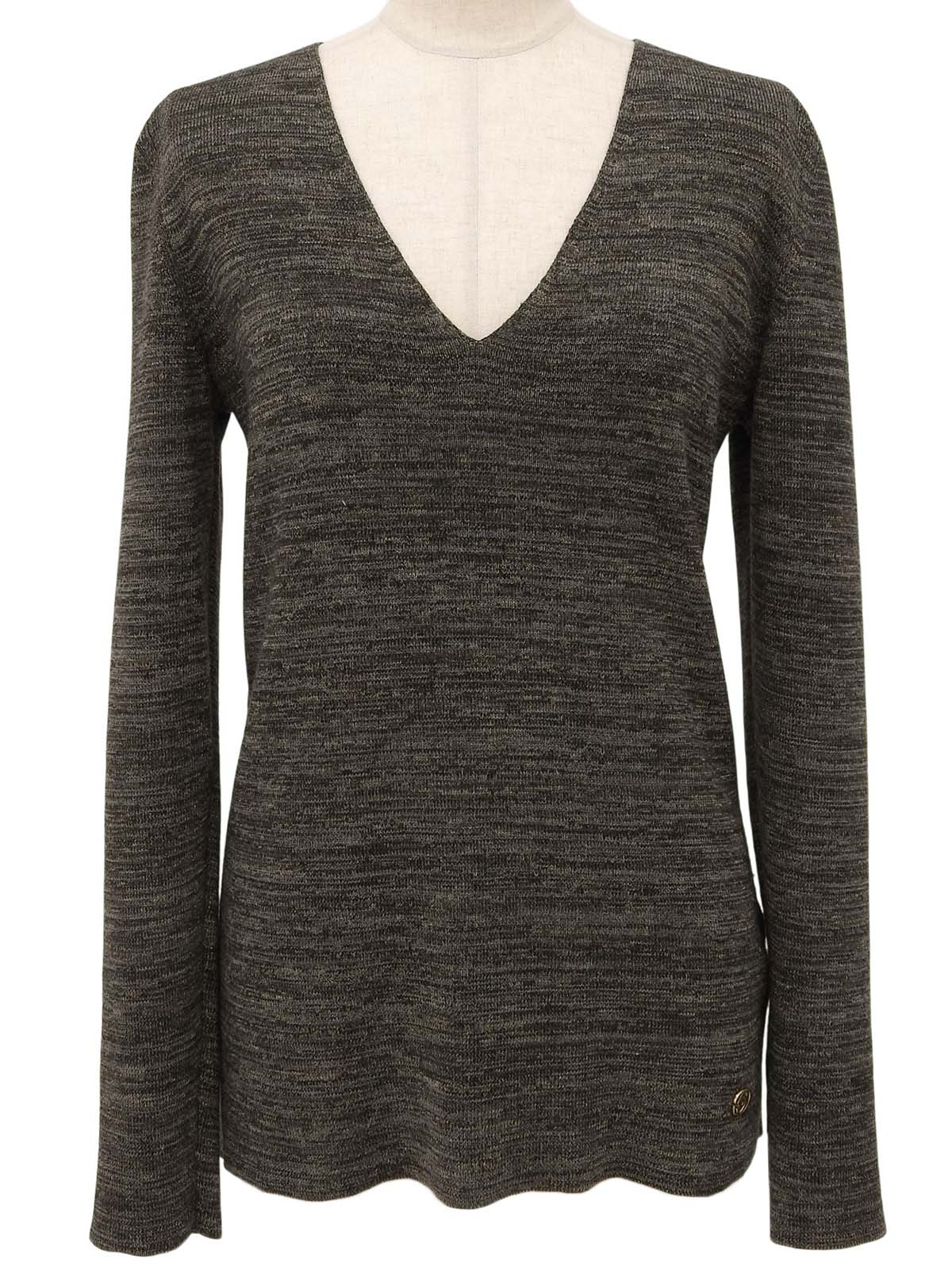 灰色V领针织衫,饰有品牌标志